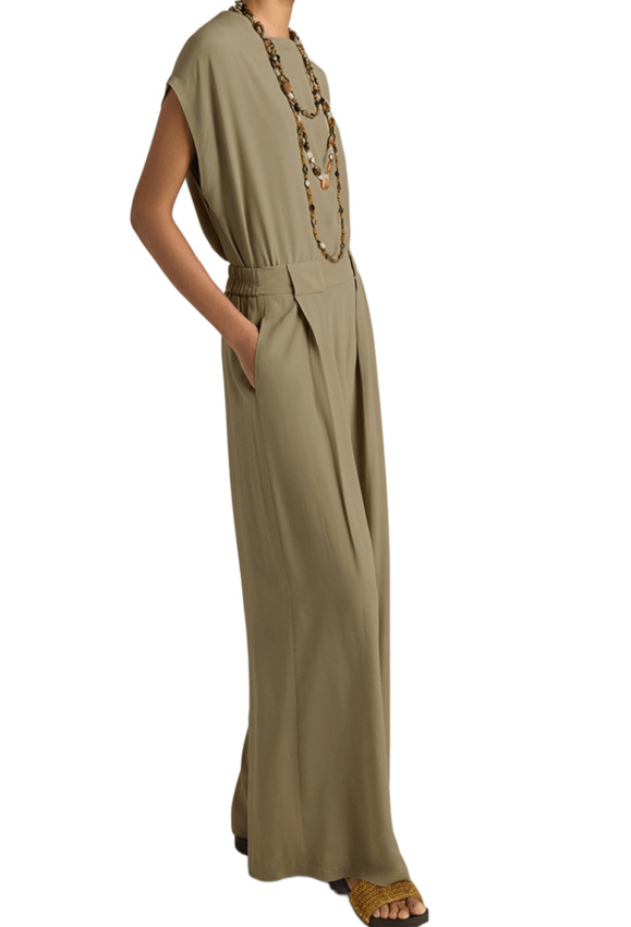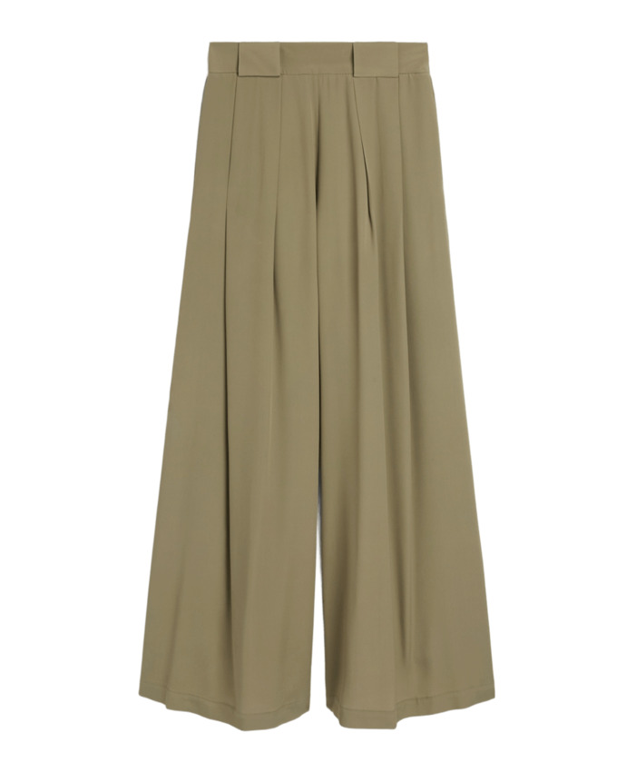 Pantalone in leggero crèpe di acetato/seta unito carry-over, a palazzo, dalla linea ampia e ariosa. Pieghe frontali bloccate da maxi passanti, tasche inserite nel fianco e cintura elasticata sul retro.