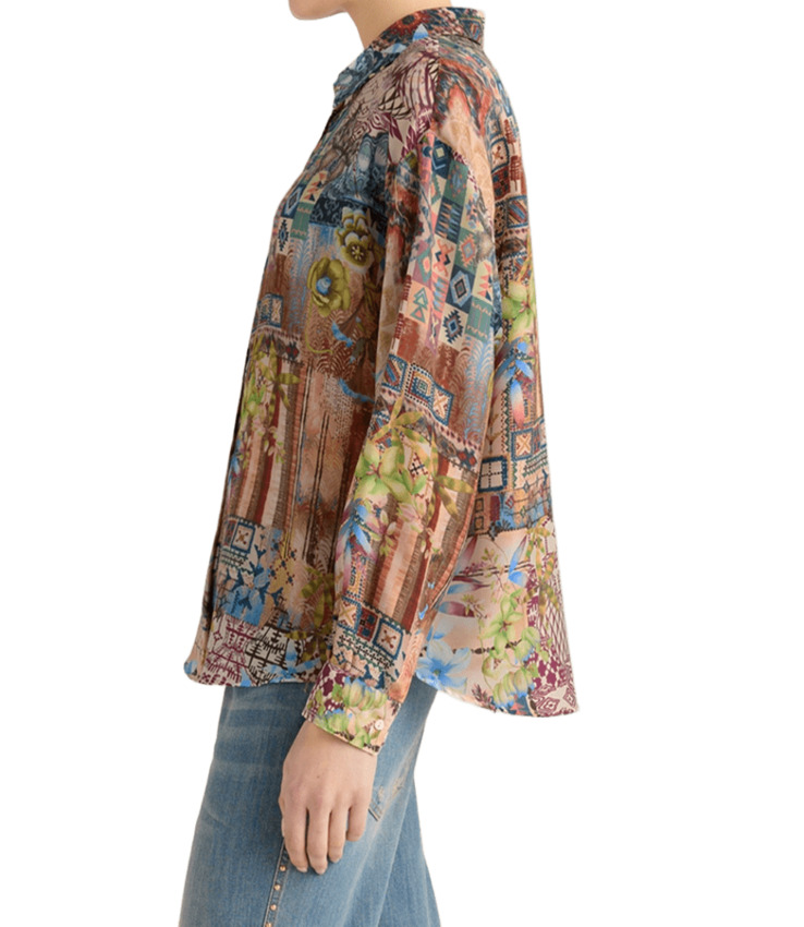 Camicia a maniche lunghe e spacco sulla schiena in prezioso habutai di pura seta stampata in Italia. Colinas, camicia dalla spalla morbida con colletto a vela, si caratterizza per lo spacco sulla schiena che permette di essere indossata anche annodata sul davanti creando un look cropped. Polsini maschili e bottoni in madreperla completano la linea di questo capo unico ed irrinunciabile.