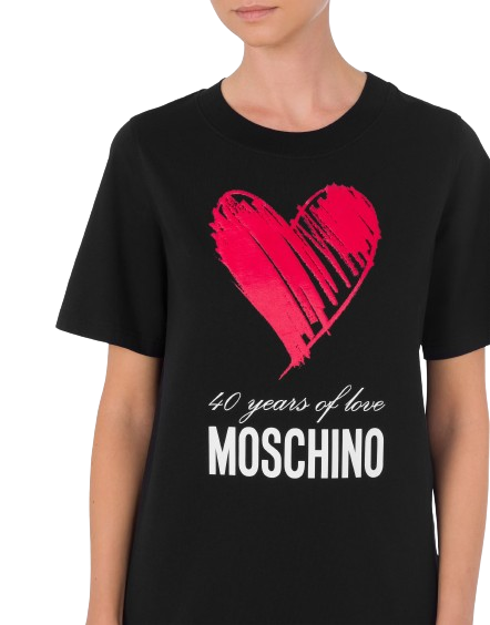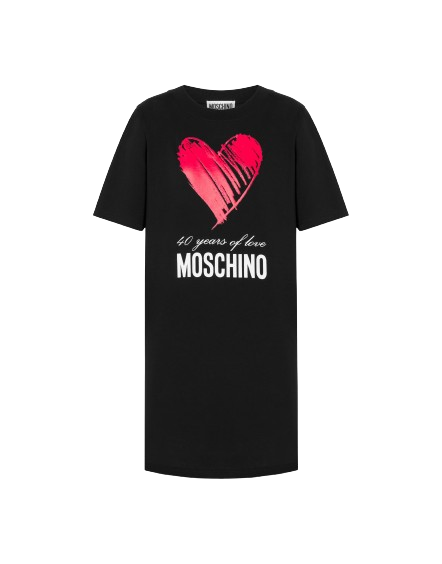 Abito corto in jersey di cotone firmato Moschino con stampa sul davanti 40 years of love con logo e cuore rosso. Presenta girocollo e maniche corte.Semplice ma glamour allo stesso tempo, in poerfetto stile Moschino