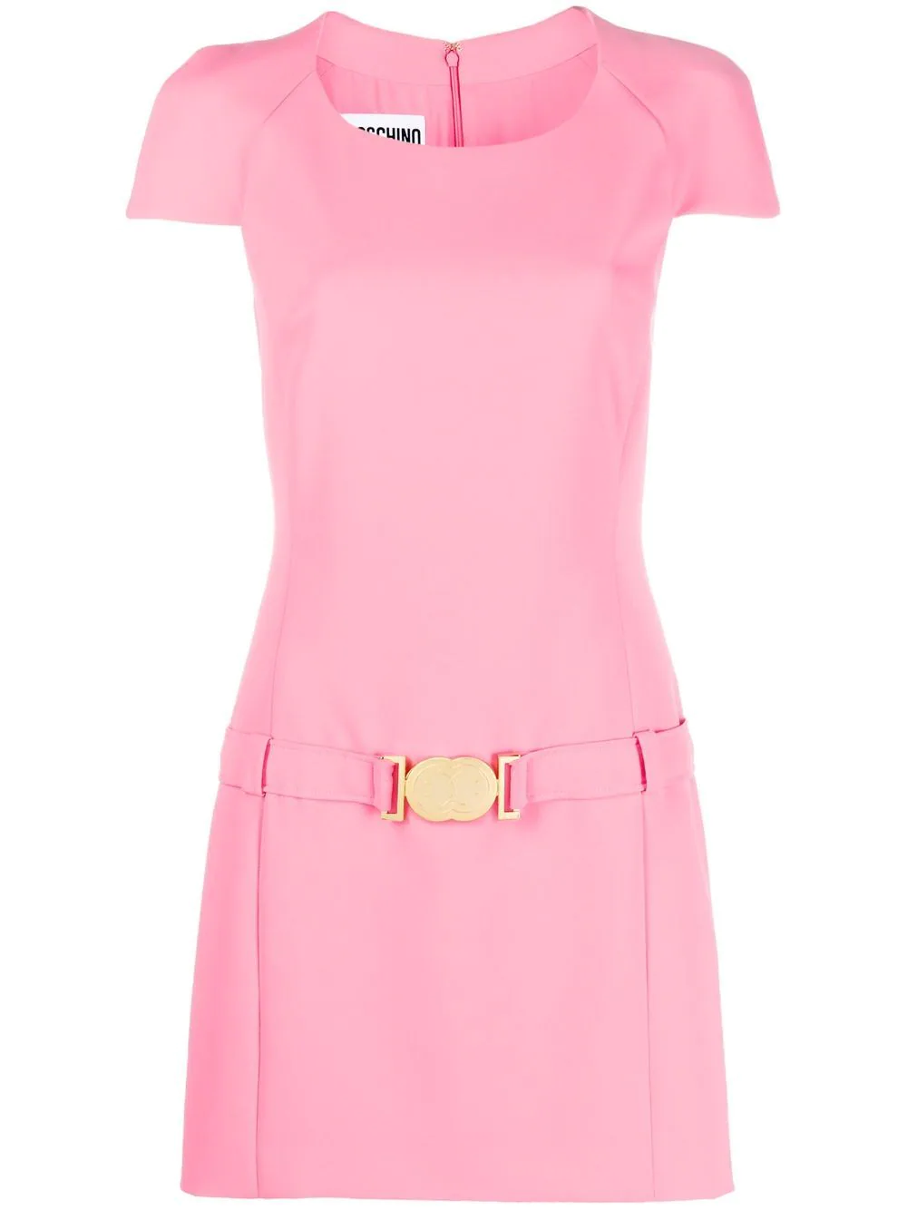 Abito corto di Moschino con cintura, scollo rotondo, maniche corte, design corto e largo, modello con cintura e orlo dritto.