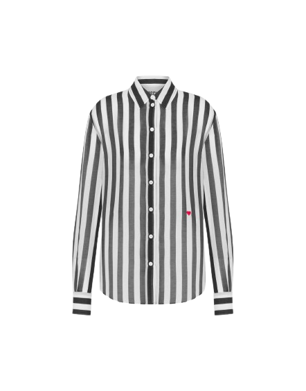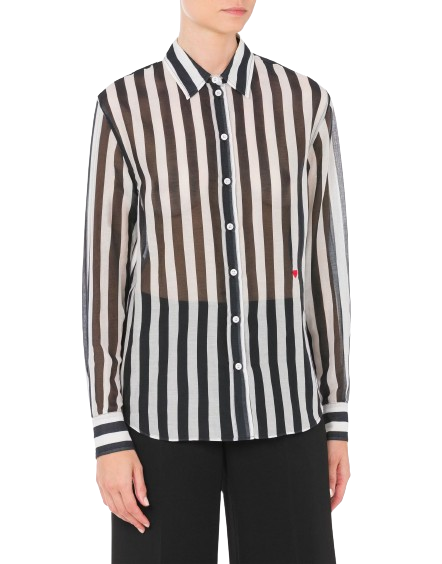 Questa camicia firmata Moschino in misto cotone e seta con stampa archivio a righe bianche e nere presnta il particolare del ricamo piccolo cuore rosso sul davanti.A maniche lunghe, riughe verticali e polsini con bottoni. Chiusura sul davanti è con bottoni.Glamour e contemporanera allo stesso tempo