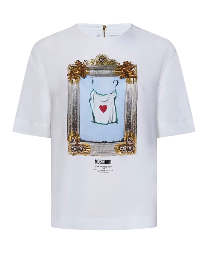 Aggiorna il tuo guardaroba con questa elegante T-shirt Moschino dotata di una chiusura parziale con zip in metallo dorato sul retro, collo a costine, spalle basse e maniche corte.Una T-shirt dal taglio rilassato, comoda e alla moda. Un capo versatile per ogni occasione.