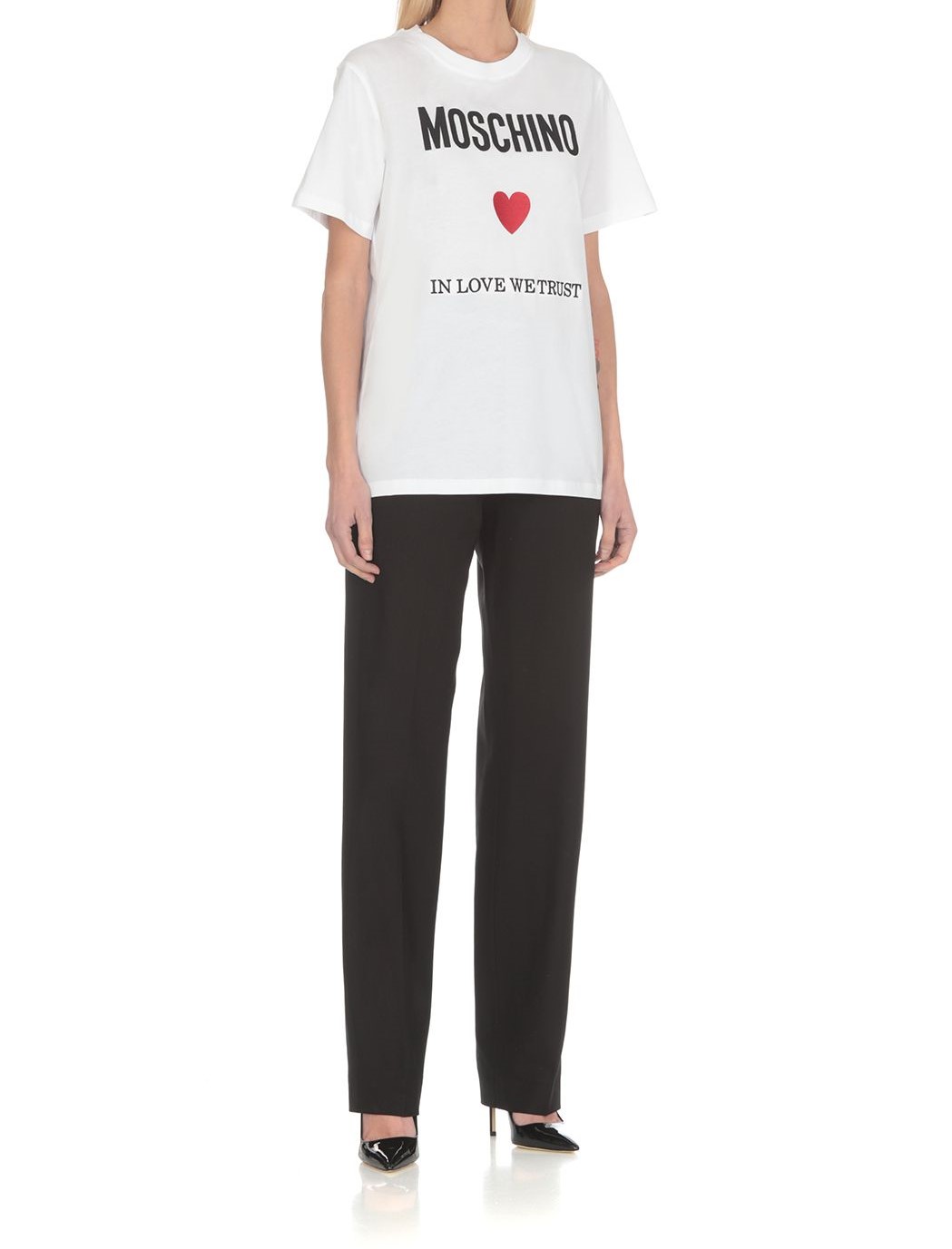 T-shirt Moschino bianca in cotone da donna con Girocollo e Maniche corte. Presenta Logo frontale con lettering ' In Love We Trust' in contrasto di colore