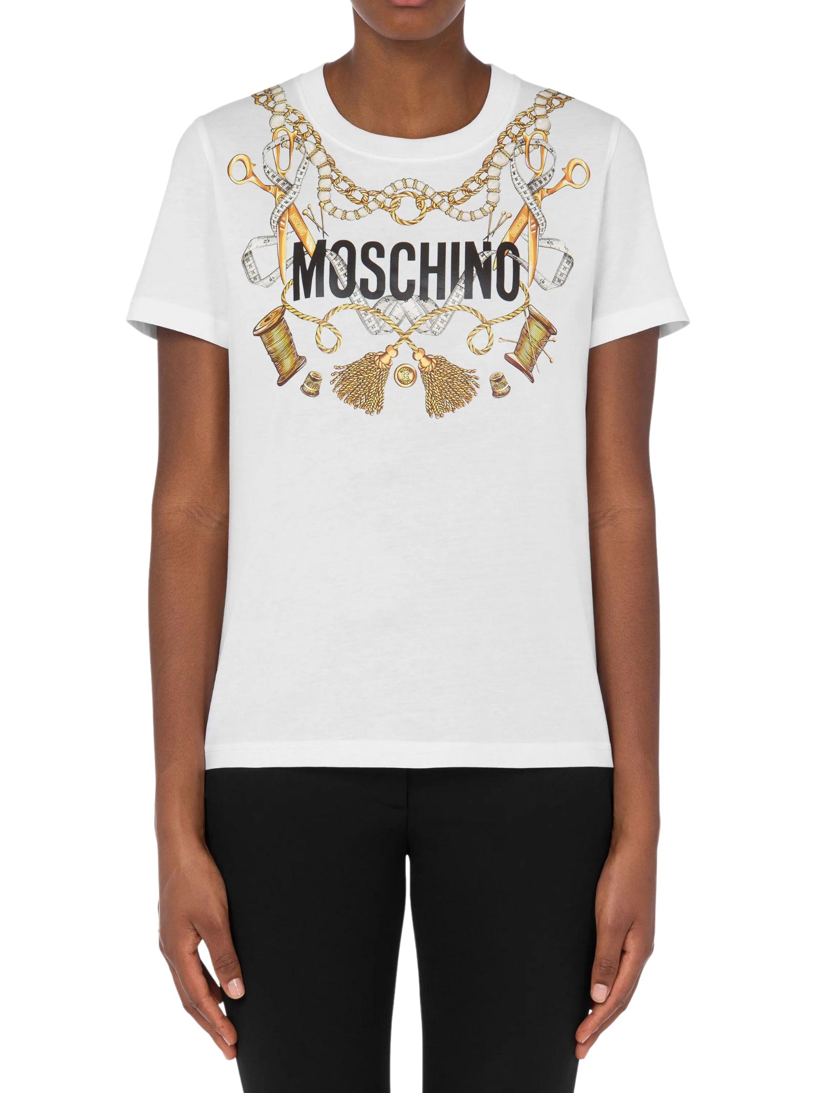 T-shirt da donna firmata Moschino a maniche corte in jersey di cotone organico con stampa logo con elementi sartoriali.