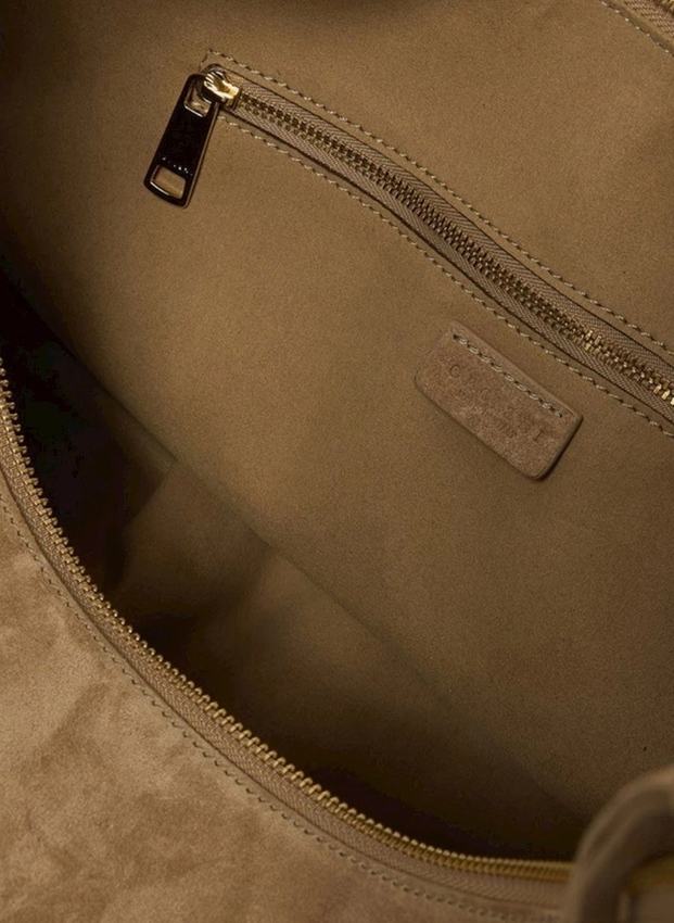 Isola Peach Fringe misura Small realizzata in suede color marrone con frange presenta tre taschini interni di cui uno con zip, chiusura con zip e manico a spalla regolabile. Metallerie finitura oro chiaro.