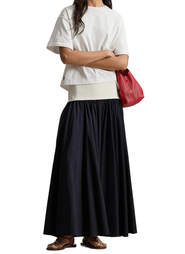 Realizzata in leggero tessuto di cotone tinto in filo, questa gonna a trapezio è tagliata per una caduta fluida ed è stata lavata per una maggiore morbidezza. L'ampio elastico in vita a contrasto è accentuato dal caratteristico pony ricamato.