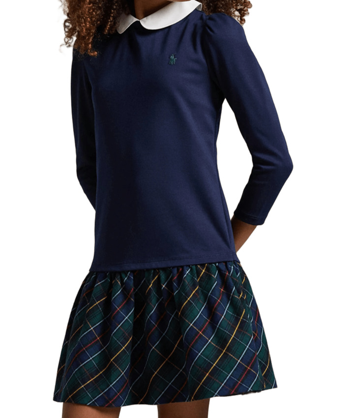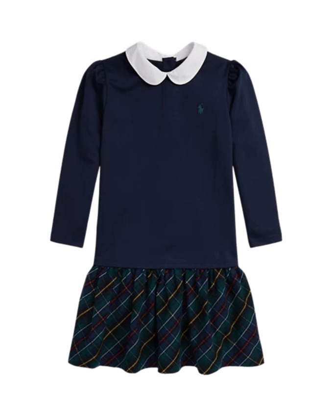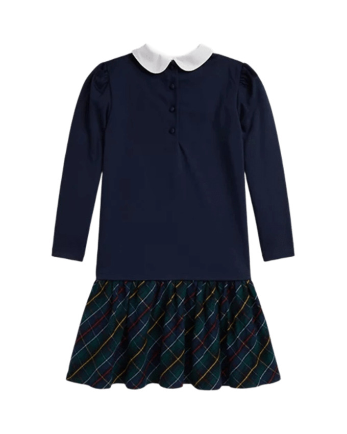 Questo abito è caratterizzato da una silhouette a vita bassa, un colletto a contrasto e una gonna scozzese intrecciata.