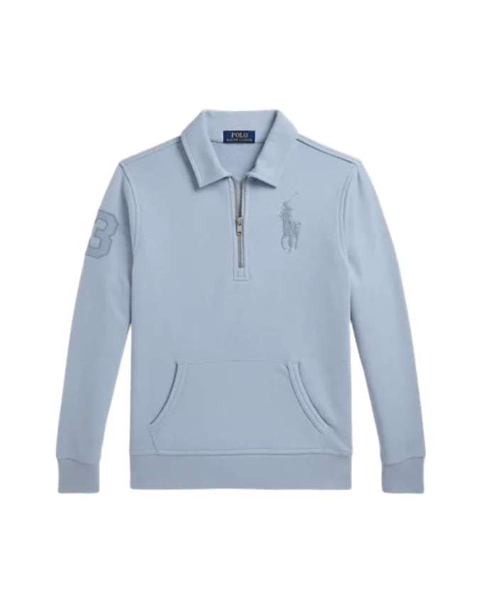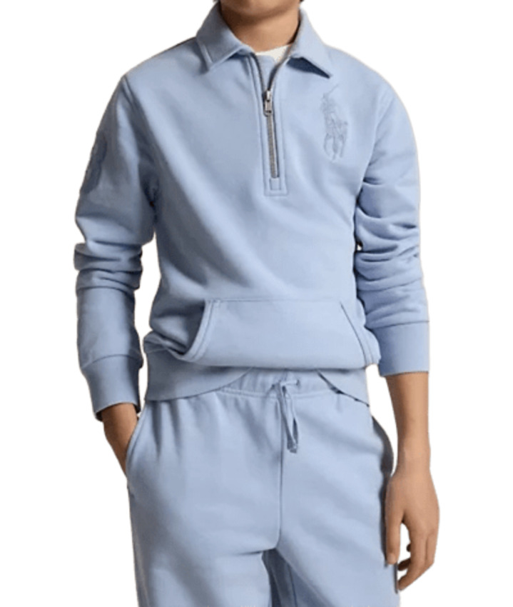 Felpa Big Pony in spugna con collo alto e zip a un quarto, pensata per un look sportivo e iconico. Realizzata in morbida spugna di misto cotone e sottoposta a lavaggio per una maggiore morbidezza, garantisce comfort e piacevolezza a contatto con la pelle. Il design è caratterizzato dallinconfondibile Big Pony sul petto e dallapplicazione in twill con il numero 3 sulla manica destra, simbolo tradizionalmente associato al capitano di una squadra di polo. La chiusura con zip a un quarto, arricchita dallesclusivo cursore con logo Polo, aggiunge praticità e stile. Le maniche lunghe con polsini a coste e lorlo a coste assicurano una vestibilità confortevole, mentre la tasca a marsupio completa il capo con un tocco funzionale e casual.