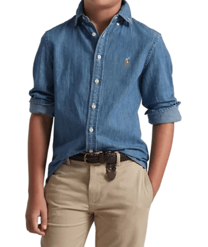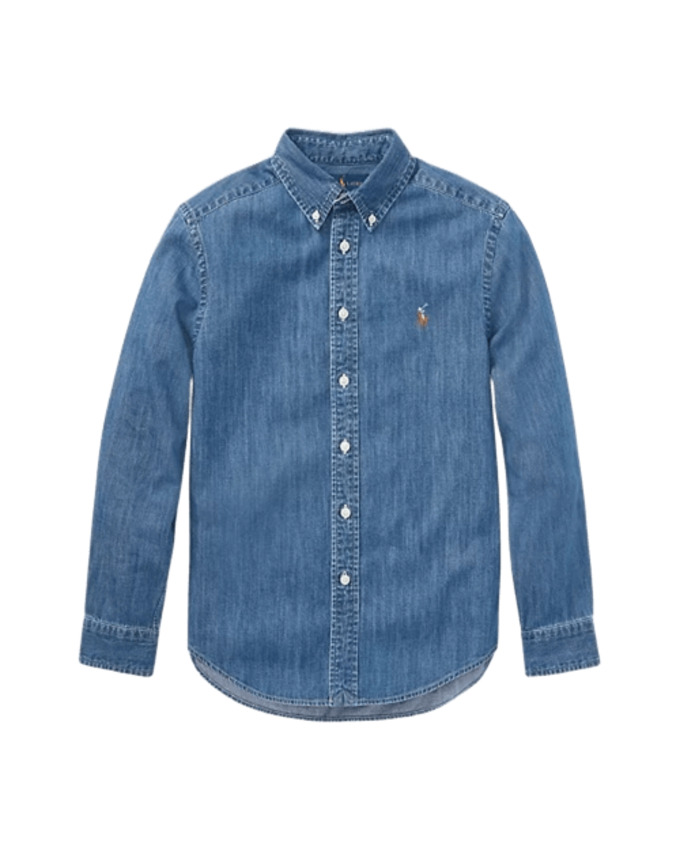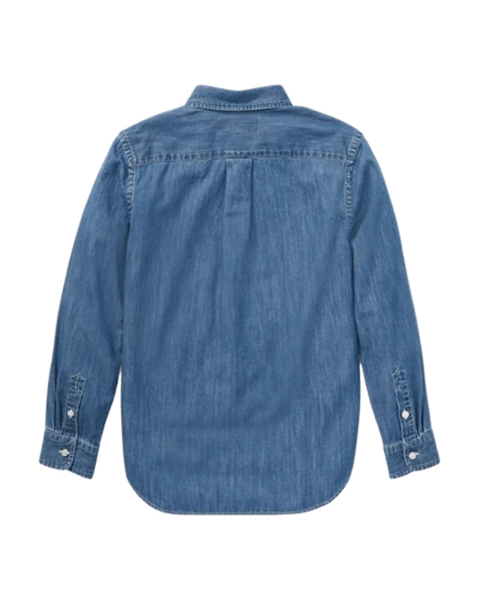 Questo capo coniuga lo stile raffinato dell'iconica camicia sportiva a un denim leggero e grintoso in puro stile Polo. Presenta esclusivo pony multicolore ricamato sul lato sinistro del torace, collo button-down, cannoncino con bottoni, maniche lunghe con polsini con bottoni e carré posteriore con pieghe a cannoncino.