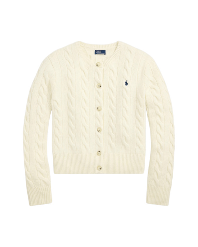 Questo cardigan a girocollo con bottoni è realizzato con un morbido misto di lana italiana e cashmere lavorato a trecce ed è impreziosito dal esclusivo pony ricamato sul torace.