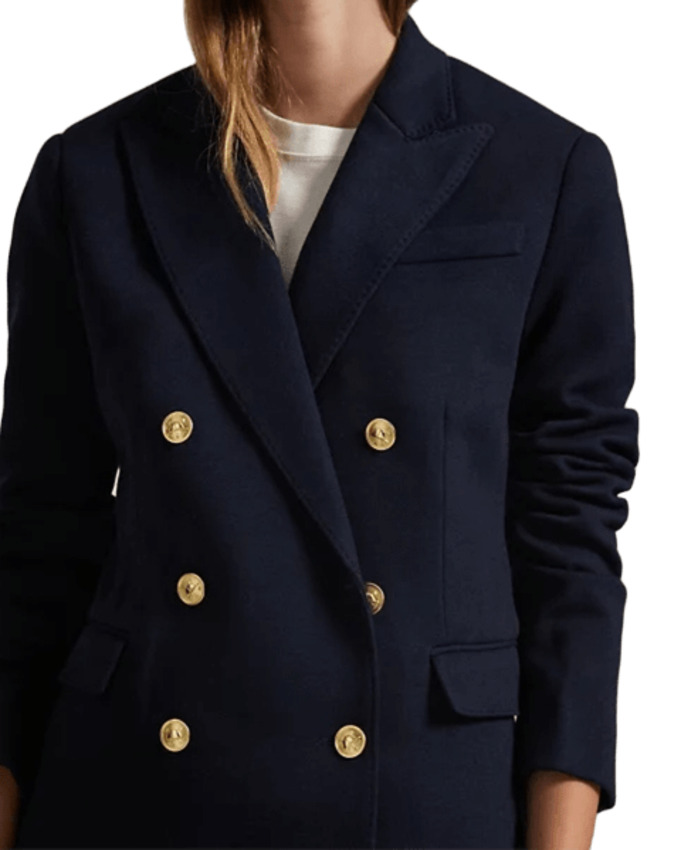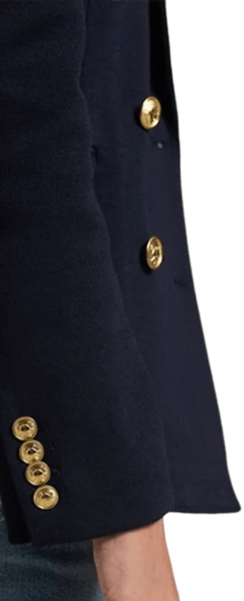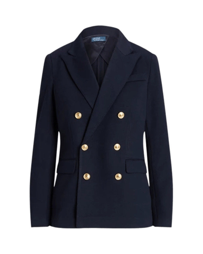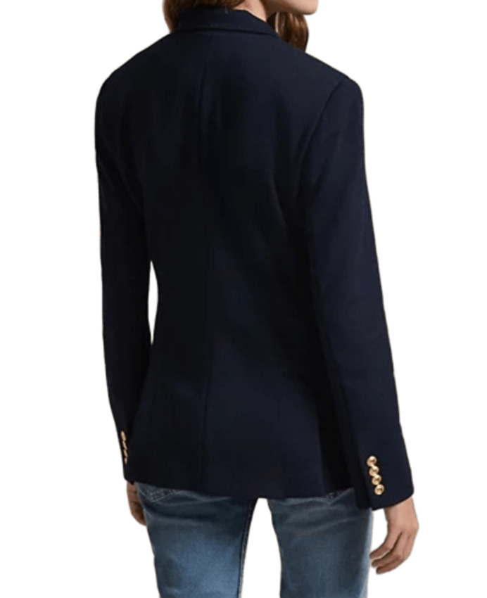 Blazer a doppio petto morbido e strutturato, caratterizzato da un esterno in maglia, spalline imbottite, revers a lancia, maniche lunghe con quattro bottoni incisi per un tocco dal fascino tradizionale e cuciture a punto principessa sul retro. Presenta oltre, una tasca a filetto a sinistra sul torace, due tasche a patta in vita sul davanti, sottocollo in feltro, maniche e carré posteriore foderati.