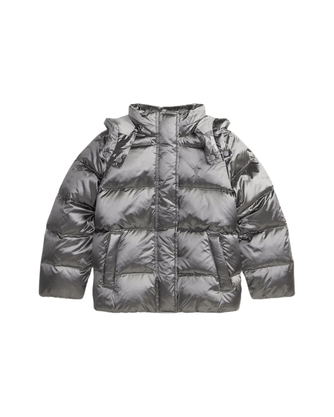 Giaccone da bambina in piuma d'oca, cappuccio staccabile, colore grigio metalizzato.