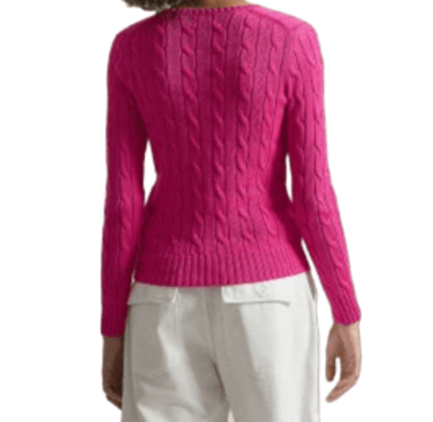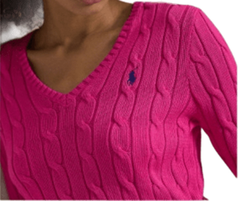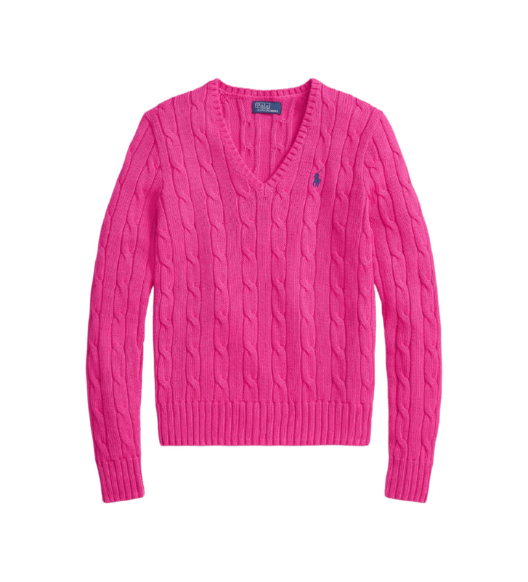 Maglia con lo scollo a V dal taglio aderente realizzata in morbido cotone pettinato presenta esclusiva lavorazione a trecce con pony ricamato sul lato sinistro del torace. Girocollo a coste, maniche lunghe con polsini a coste. Orlo con lavorazione a coste.