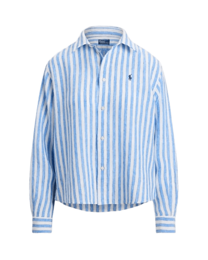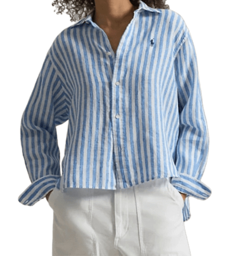 Questa camicia in lino traspirante presenta un taglio ampio corto e un motivo a righe all over. Maniche lunghe con polsini con bottoni, spalle basse, collo a punta, carré posteriore con pieghe a cannoncino e lembo orlato.