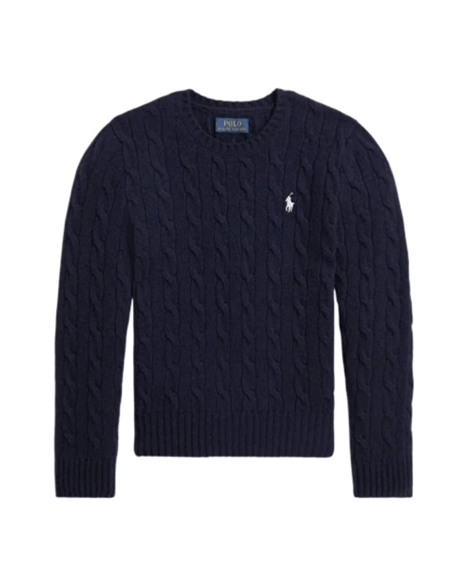 Capo classico per i mesi più freddi, questa maglia girocollo, dalla lavorazione a trecce in misto lana e cashmere di peso medio è ricamata con  l'esclusivo pony sul lato sinistro del torace. Ha maniche lunghe con polsini a coste, l'orlo con lavorazione a coste.