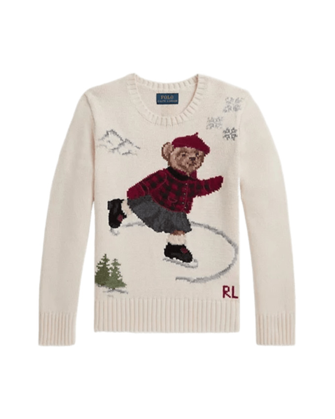Questa maglia a girocollo utilizza più di 20 filati diversi per raffigurare l'amato Polo Bear con un esclusivo outfit Ralph Lauren che pattina sul ghiaccio.