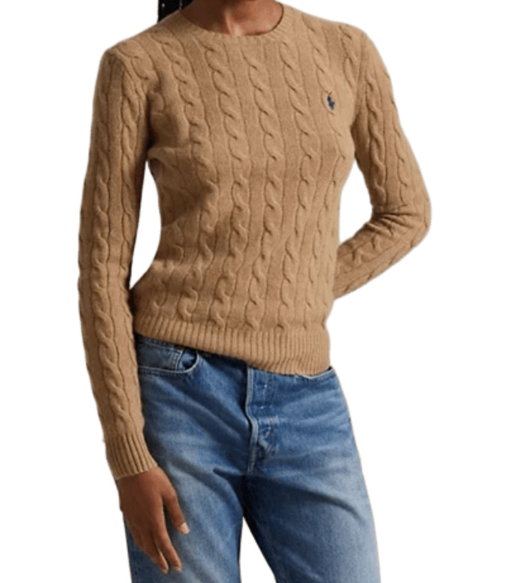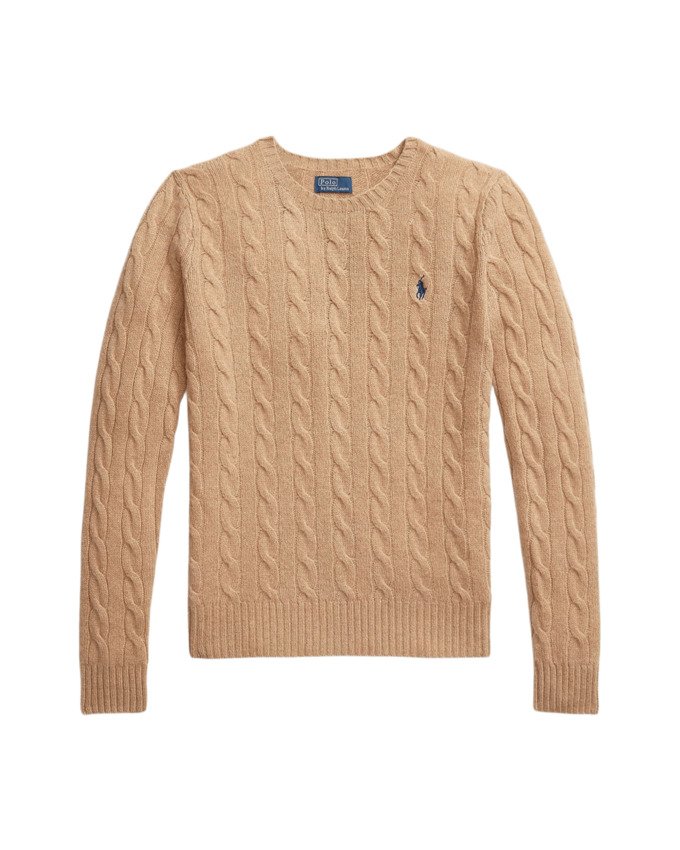 Maglia a trecce in lana e cashmere, vestibilità slim con lunghezza ai fianchi. Il design girocollo con maniche lunghe è rifinito da bordi a coste su scollo, polsini e fondo, mentre il pony ricamato aggiunge un tocco iconico al modello.