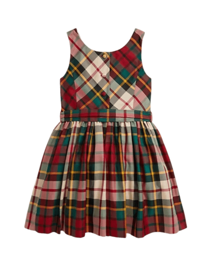 Perfetto per la stagione, questo abito in twill presenta una silhouette svasata senza maniche e un festoso motivo scozzese. Completa il modello una fascia coordinata, rimovibile.