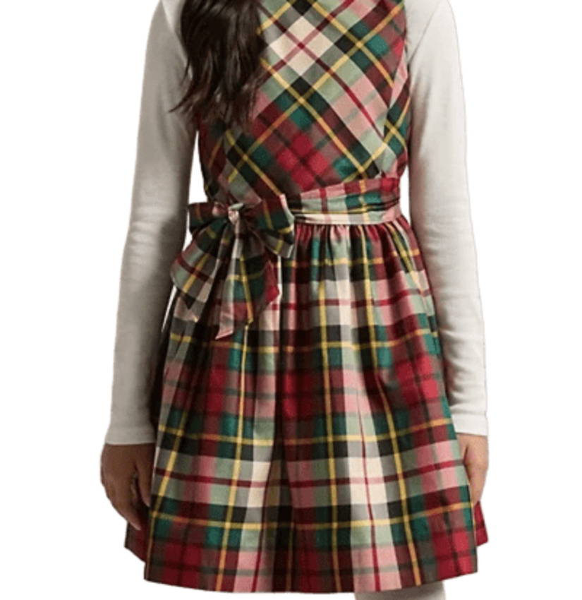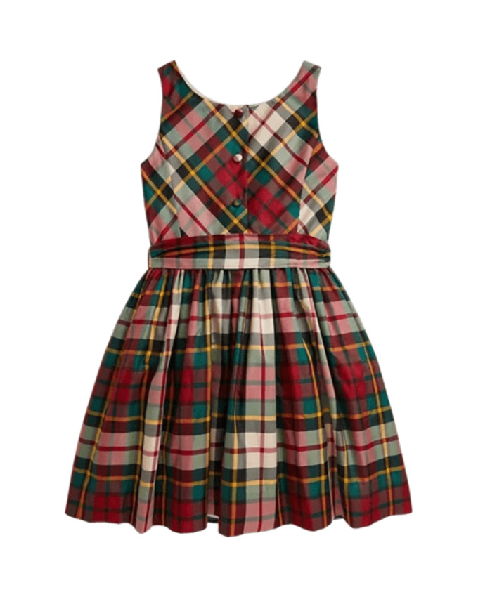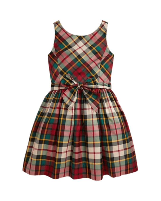 Perfetto per la stagione, questo abito in twill presenta una silhouette svasata senza maniche e un festoso motivo scozzese. Completa il modello una fascia coordinata, rimovibile.