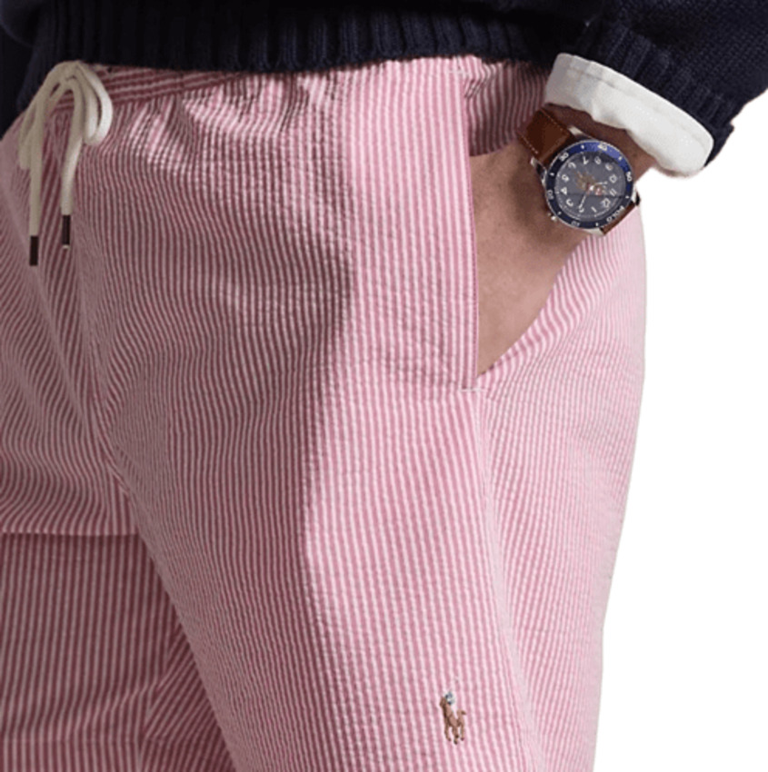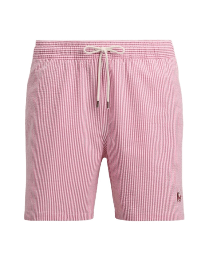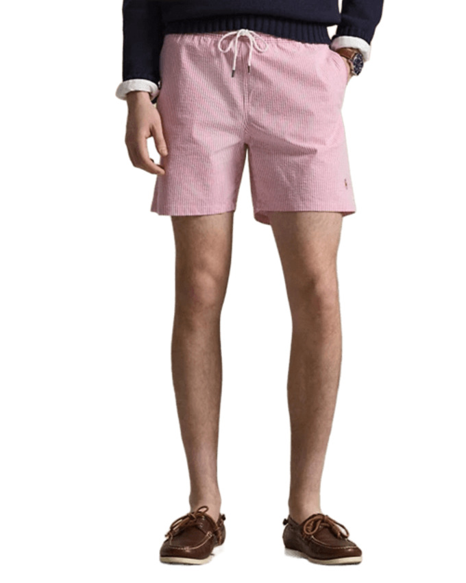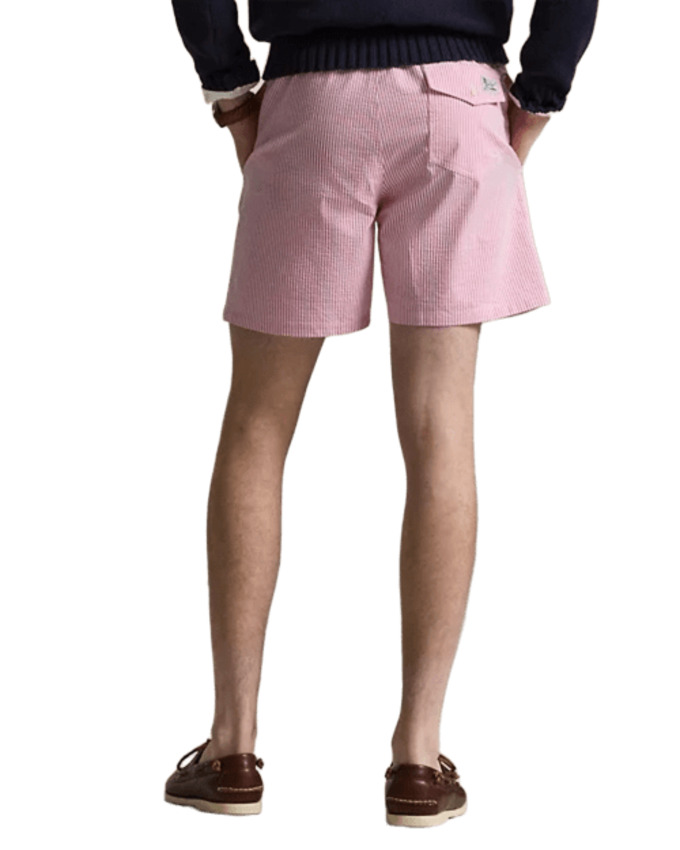 Il seersucker stretch e le righe bengalesi conferiscono a questi boxer da mare foderati in rete un iconico look Polo. Presentano fascia in vita elasticizzata con coulisse, tasche laterali all'americana e tasca con bottone sul lato posteriore destro.