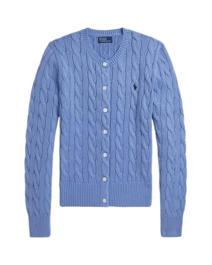 Cardigan aderente a girocollo, realizzato in puro cotone dalla classica lavorazione a trecce, presenta chiusura con bottoni e finitura in gros grain.