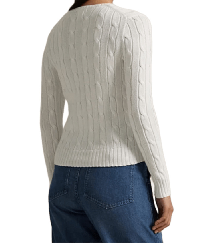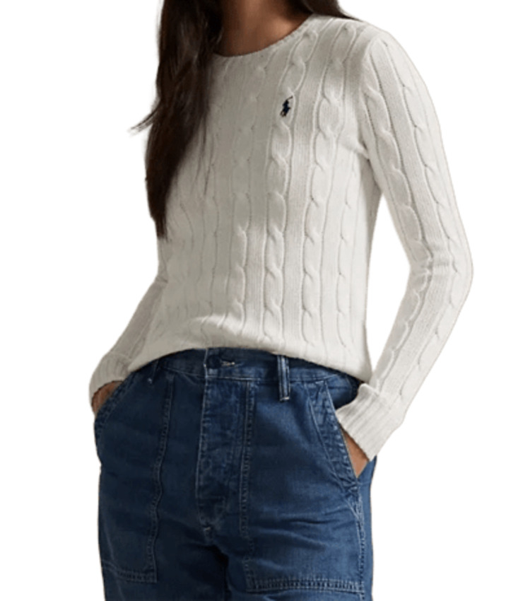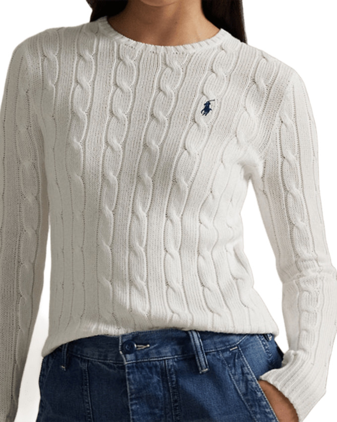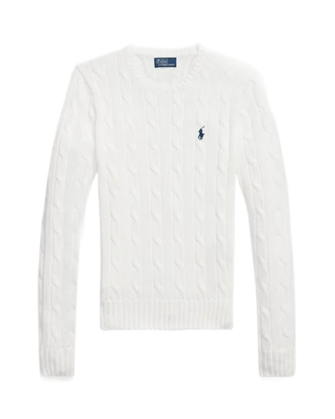 Maglia a girocollo dal taglio aderente realizzata in morbido cotone pettinato presenta esclusiva lavorazione a trecce con pony ricamato sul lato sinistro del torace. Girocollo a coste, maniche lunghe con polsini a coste. Orlo con lavorazione a coste.