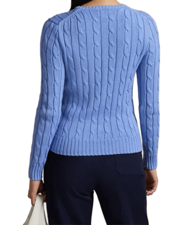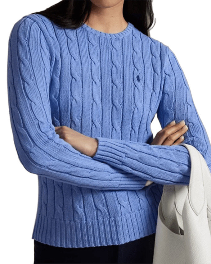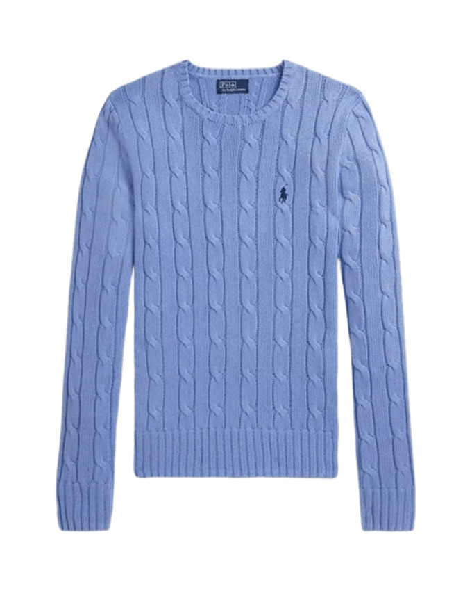 Maglia a girocollo dal taglio aderente realizzata in morbido cotone pettinato presenta esclusiva lavorazione a trecce con pony ricamato sul lato sinistro del torace. Girocollo a coste, maniche lunghe con polsini a coste. Orlo con lavorazione a coste.