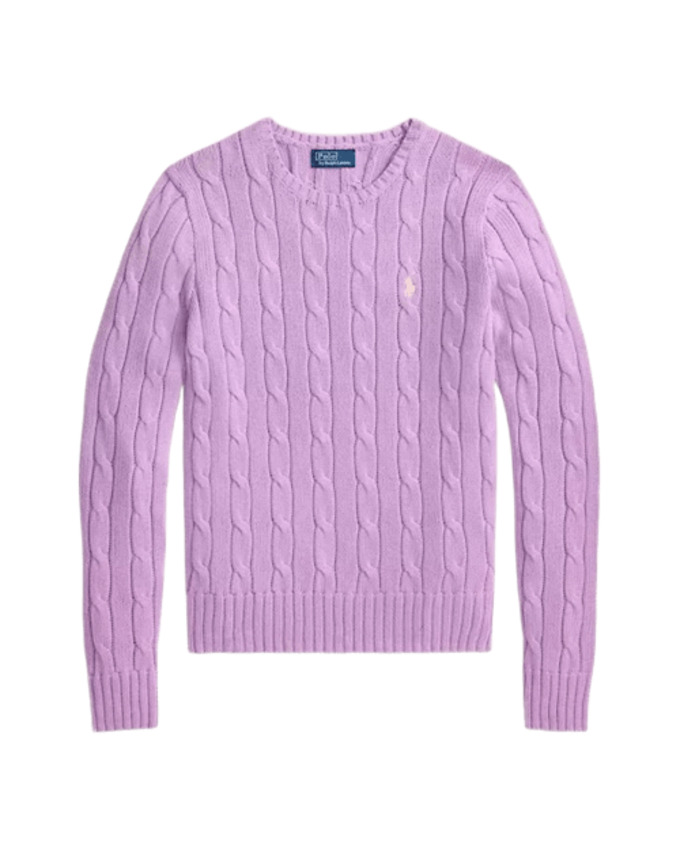 Maglia a girocollo dal taglio aderente realizzata in morbido cotone pettinato presenta esclusiva lavorazione a trecce con pony ricamato sul lato sinistro del torace. Girocollo a coste, maniche lunghe con polsini a coste. Orlo con lavorazione a coste.