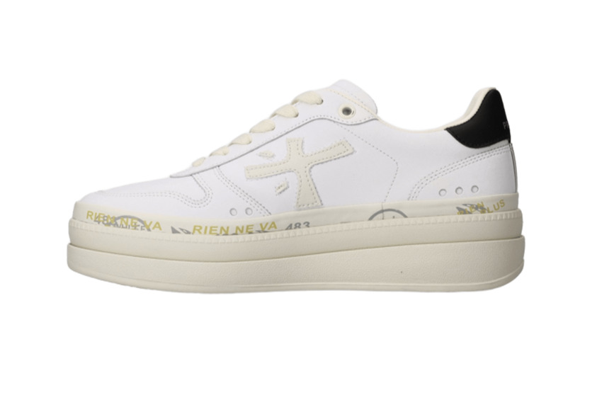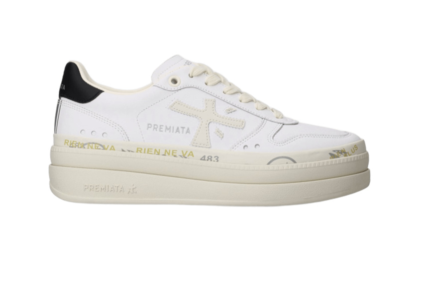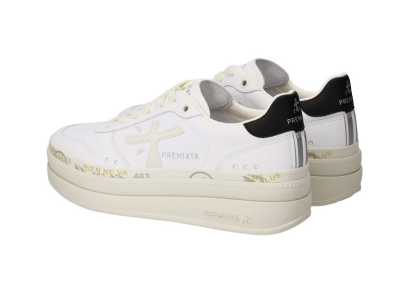 Tra i nuovi must have di Premiata. Lo stile raggiunge nuove vette, unendo design come la suola platform doppio strato con unintersuola impreziosita dagli iconici timbri del brand.