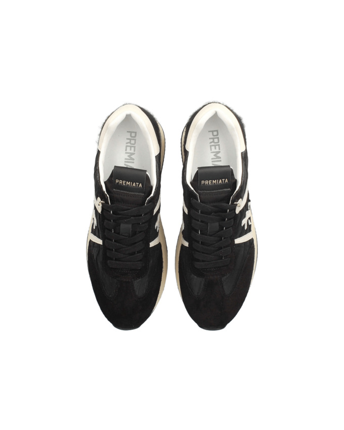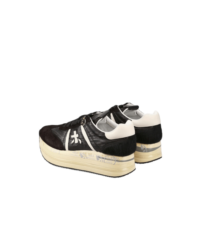 Sneakers da donna con tomaia in pelle pregiata e tessuto, fondo platform personalizzato dalla serigrafia logata Premiata. Colore nero