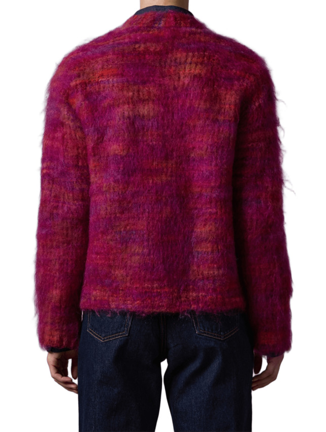 Cardigan a coste dalla vestibilità comoda realizzato con un mix di lana e mohair dall'effetto peloso. Presenta spalle scese ed è arricchito dall'utilizzo di un filato stampato a effetto multicolor e un trattamento finale di spazzolatura. Rifinito con fondi e polsi a costine.