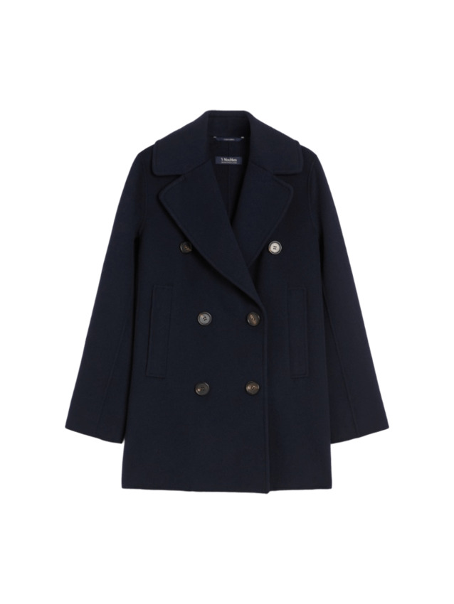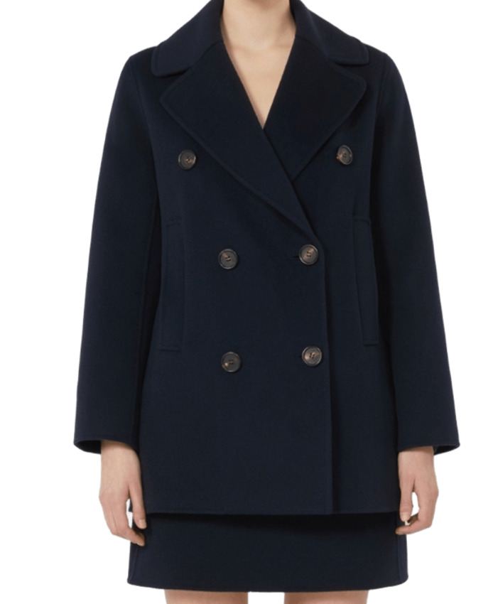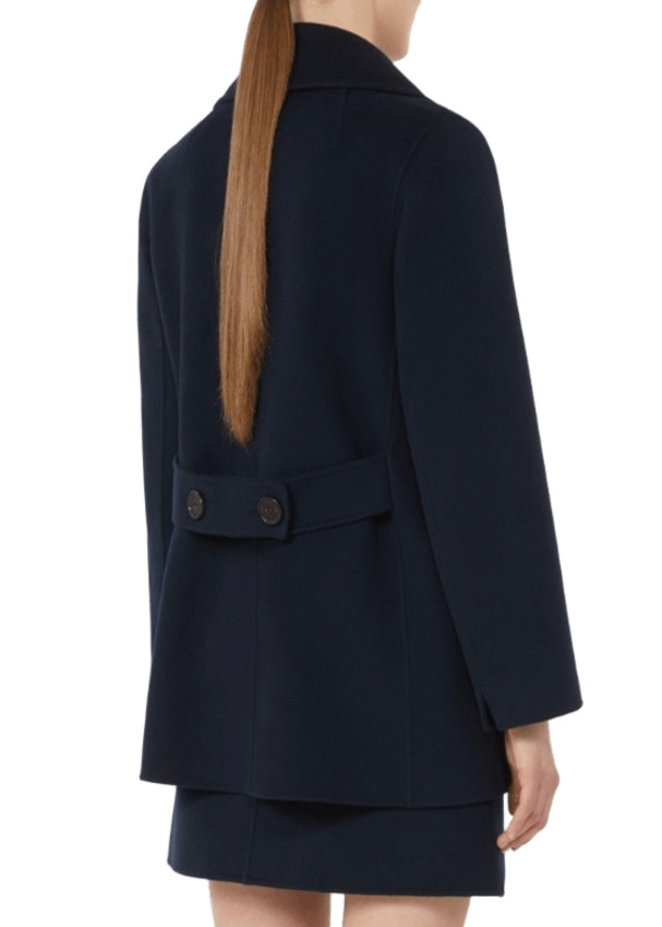 Cappotto caban da donna, doppiopetto in pura lana, colore blu