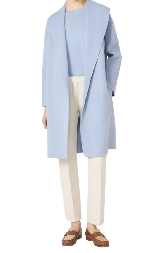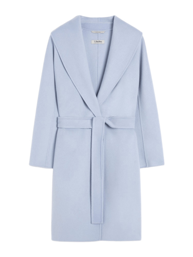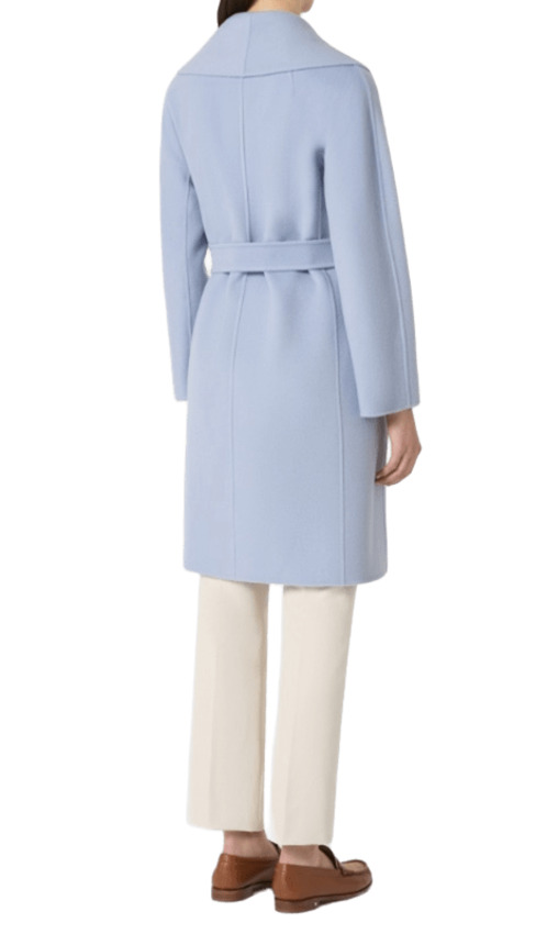 Cappotto da donna in pura lana vergine , a vestaglia con cintura in vita, colore azzurro