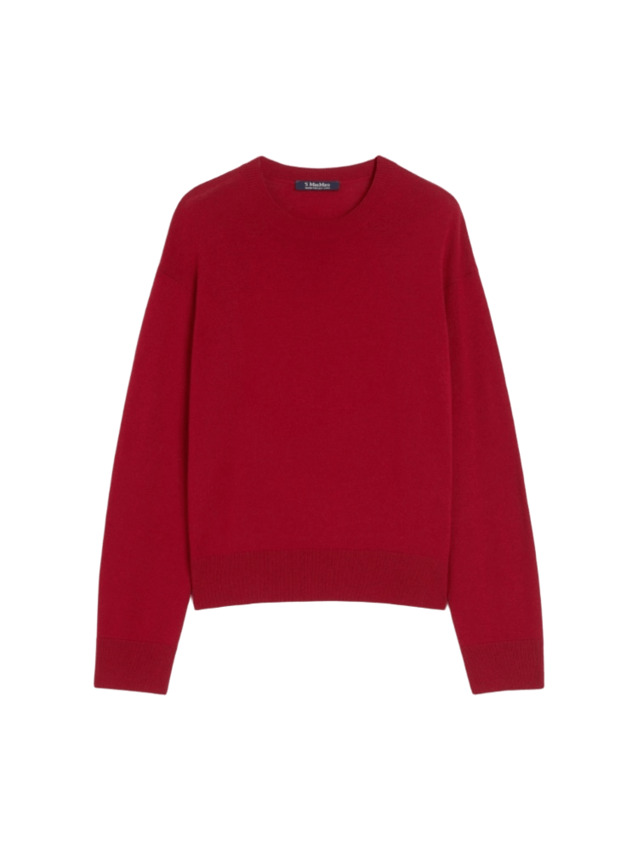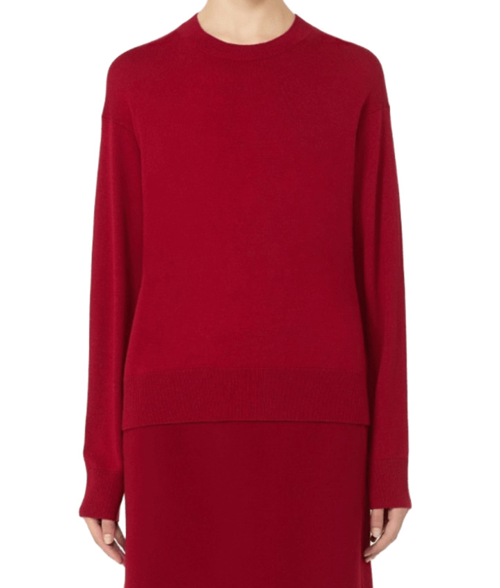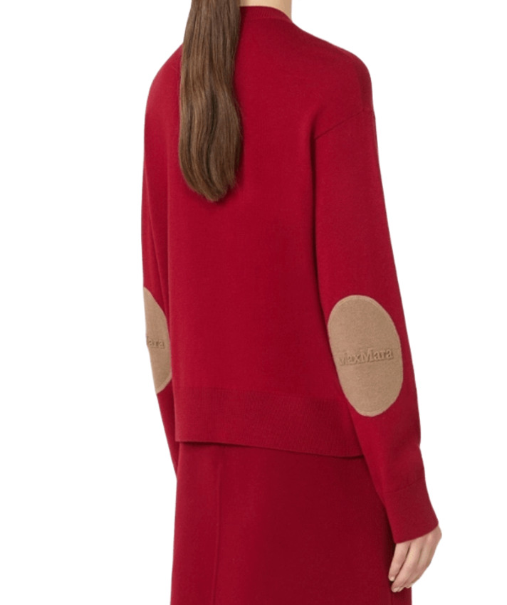 Maglia da donna in lana con toppe color cammello sui gomiti, girocollo, manica lunga, colore rosso