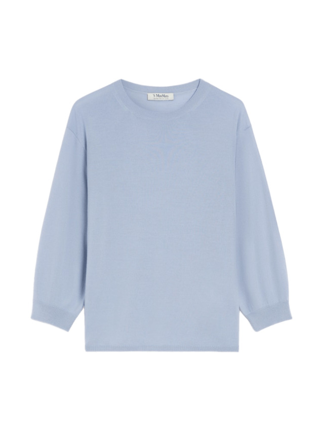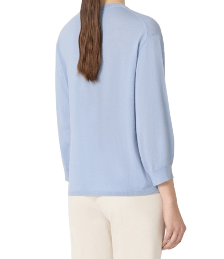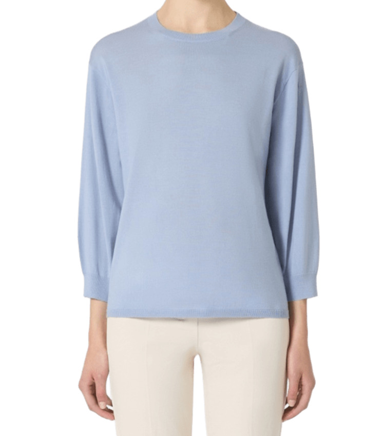 Maglia da donna in pura lana dalla linea dritta, manica a 3/4, colore azzurro
