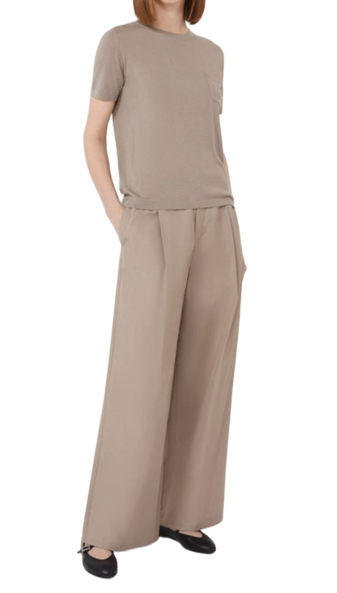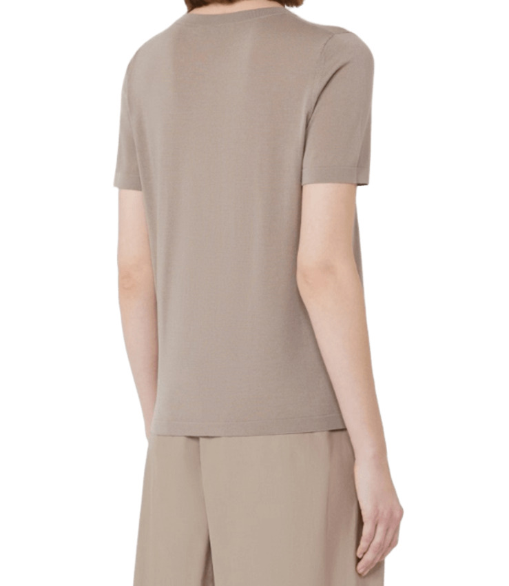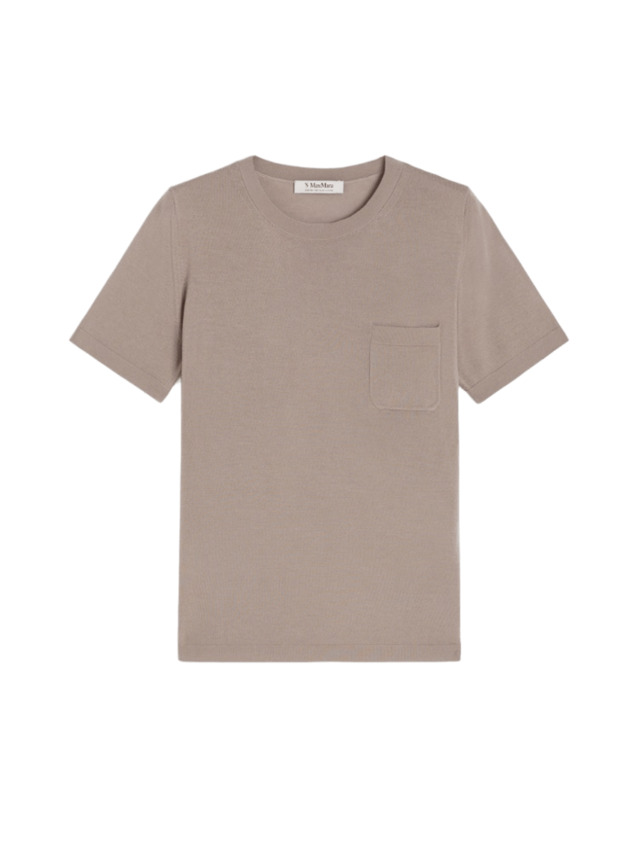 Maglia da donna in pura lana, mezza manica, taschino, color tortora