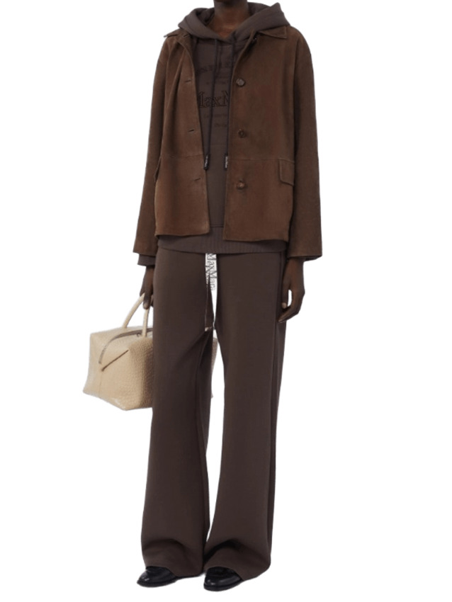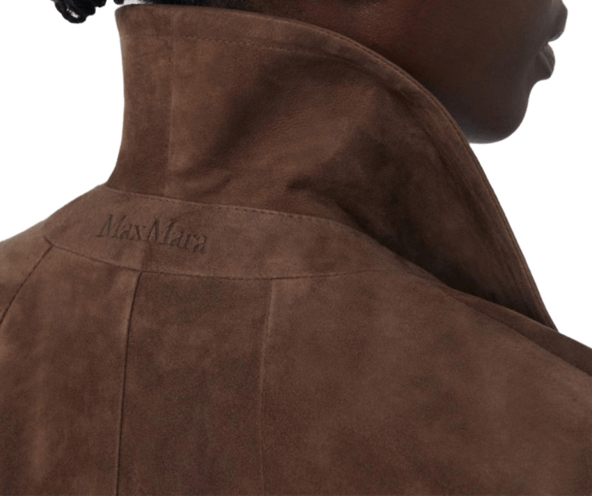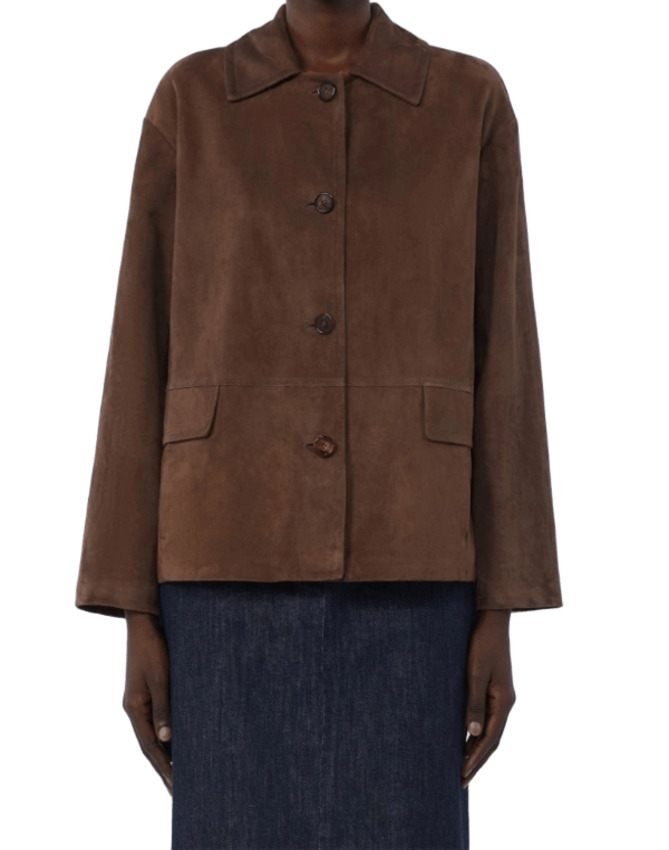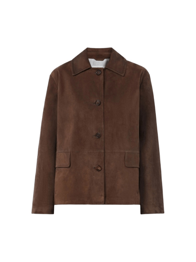Giacca in pelle scamosciata, monopetto con tagli e impunture stile pelletteria. Linea leggermente sfiancata con spacco centrale sul retro, colletto a camicia, maniche lunghe con spalla scesa. Presenta chiusura frontale con 4 bottoni a vista e tasche a filetto verticale con patta applicata sul davanti.