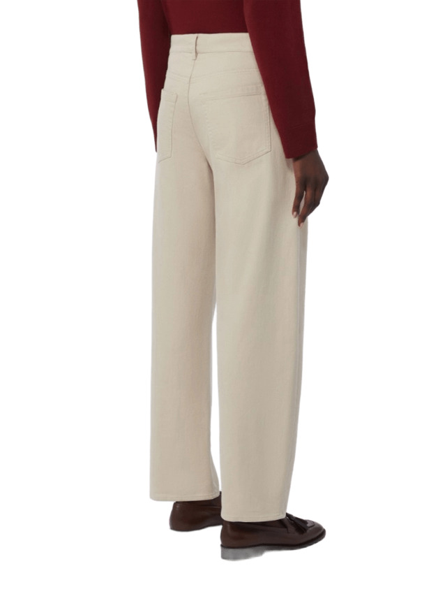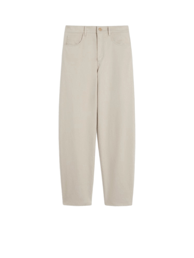 Pantalone 5 tasche in bull di cotone stretch lavato in capo. Caratterizzato da una silhouette barrel leg, chiusura con zip coperta e bottone a chiodo color oro. Presenta tasche a toppa sul retro, passanti per cintura in vita, rivetti in metallo e impunture in tono.