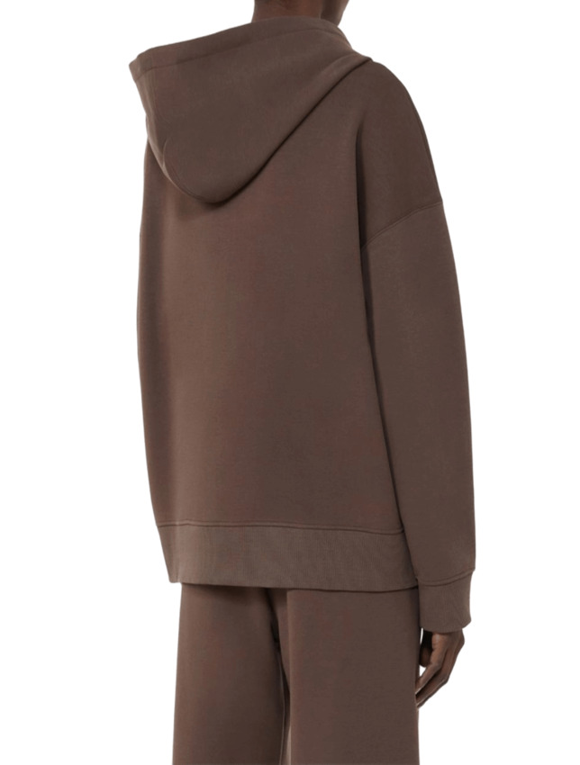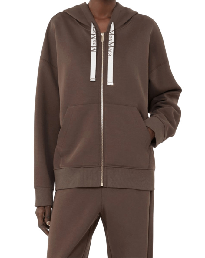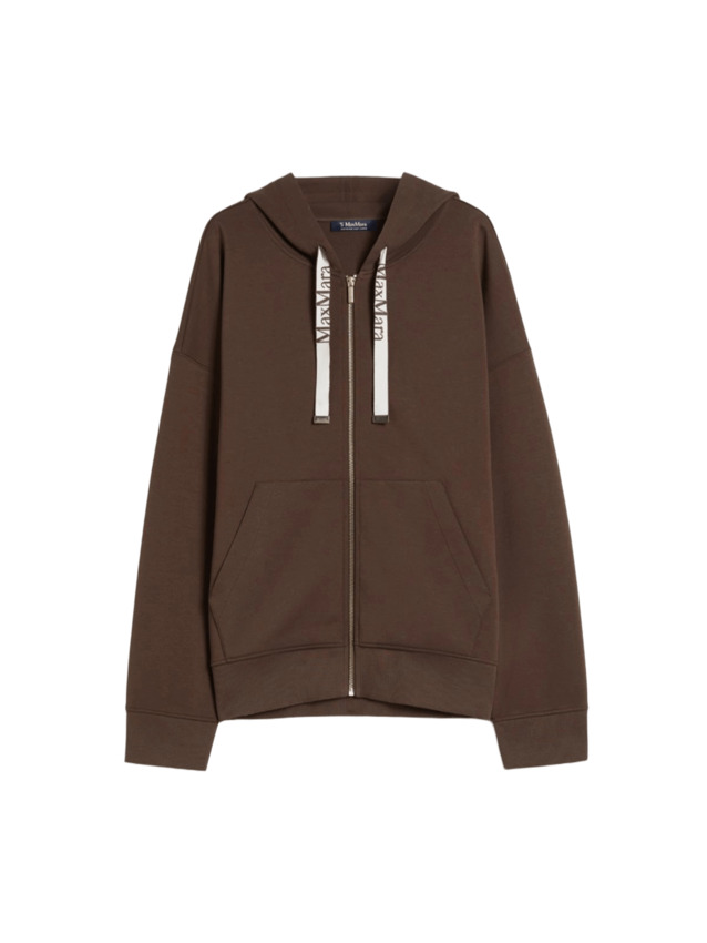 Felpa in jersey di cotone tecnico con cappuccio a coulisse e nastri con logo jacquard. Modello boxy con maniche lunghe a giro basso, chiusura frontale con zip e tasche marsupio sul davanti.