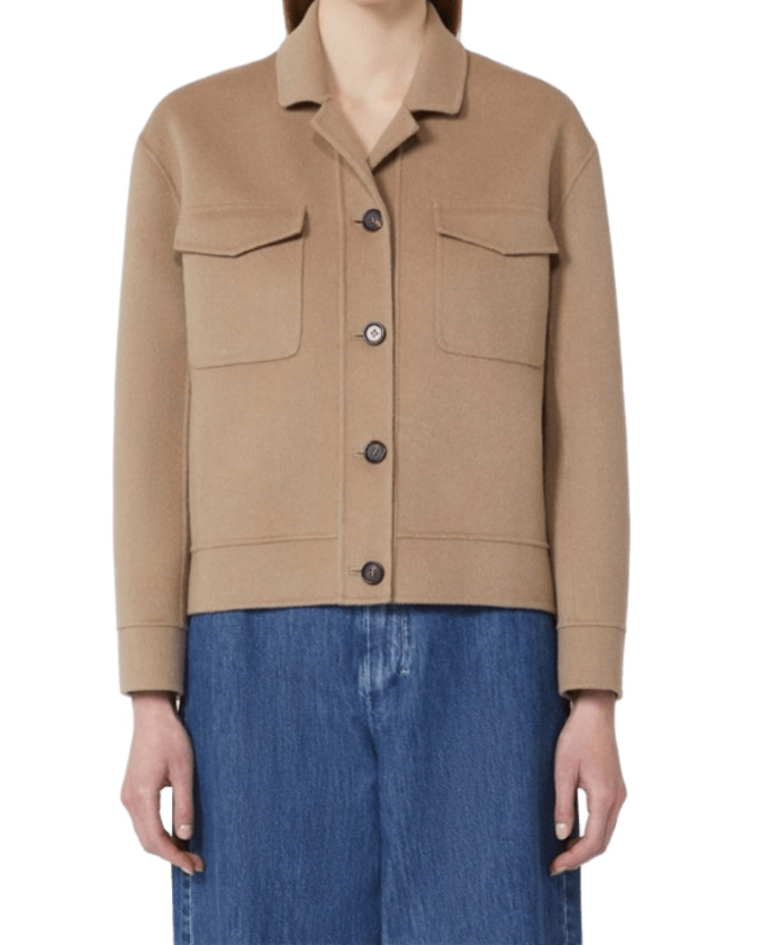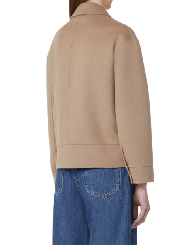 Giacca corta in doppio drap di pura lana, cucita a mano. Caratterizzata da tasche con patta applicate sul petto, linea dritta con spacchi laterali, collo a rever piccolo, maniche con spalla scesa e polsino con bottone laterale.