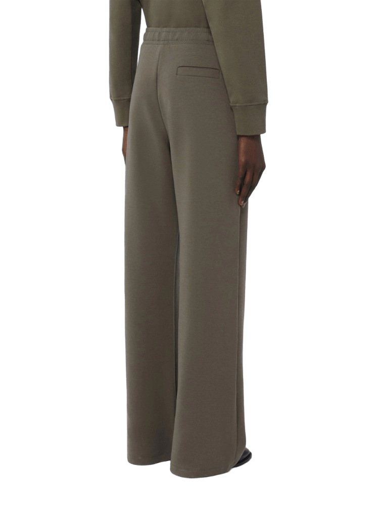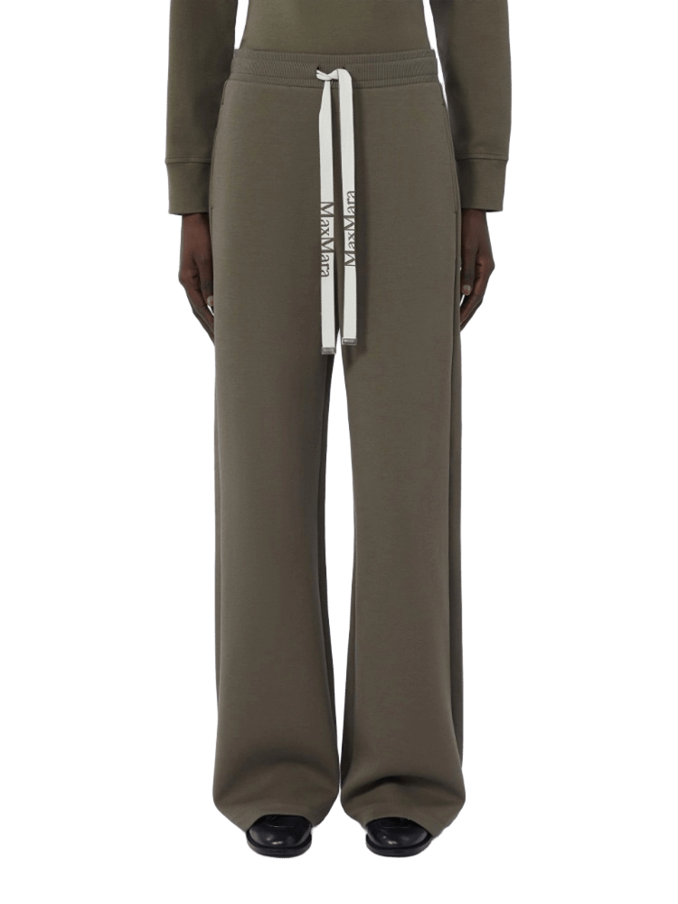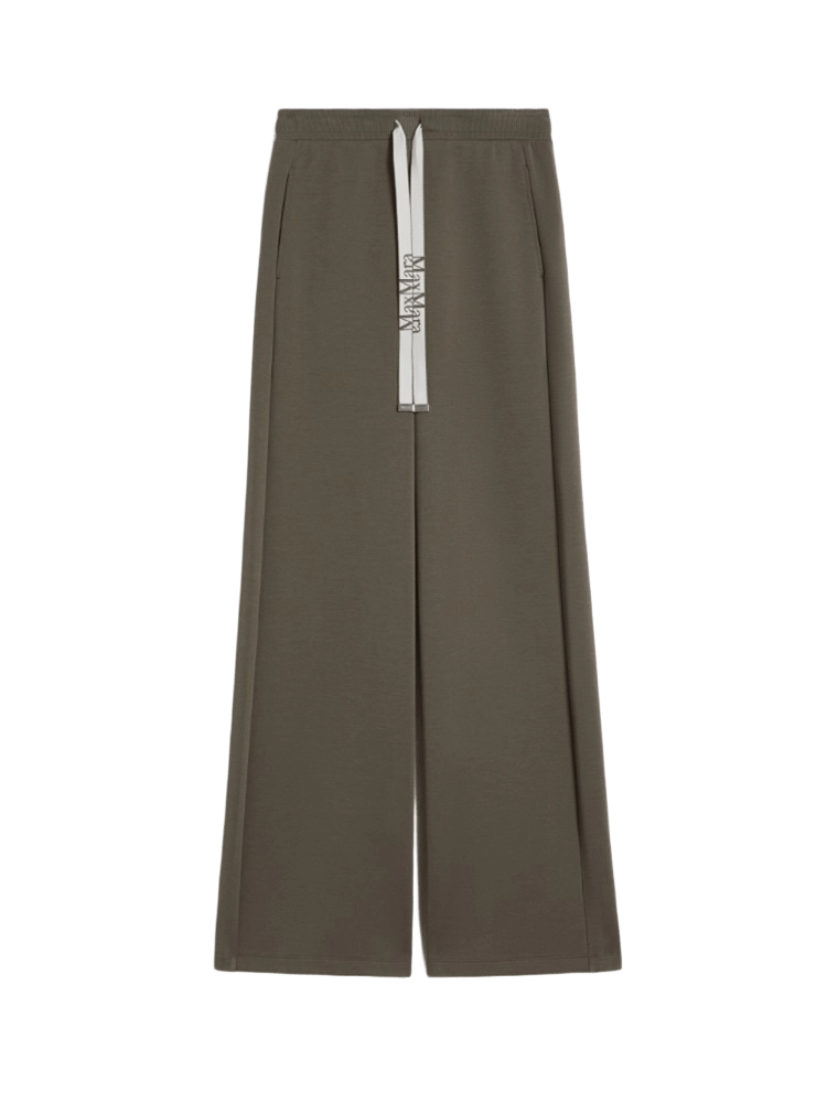 Pantalone in jersey di cotone dalla linea morbida e dalla mano tecnica. Presenta gamba larga, vita elasticizzata con coulisse in nastro jacquard, tasche inserite nei fianchi e taschino a filetto sul retro.