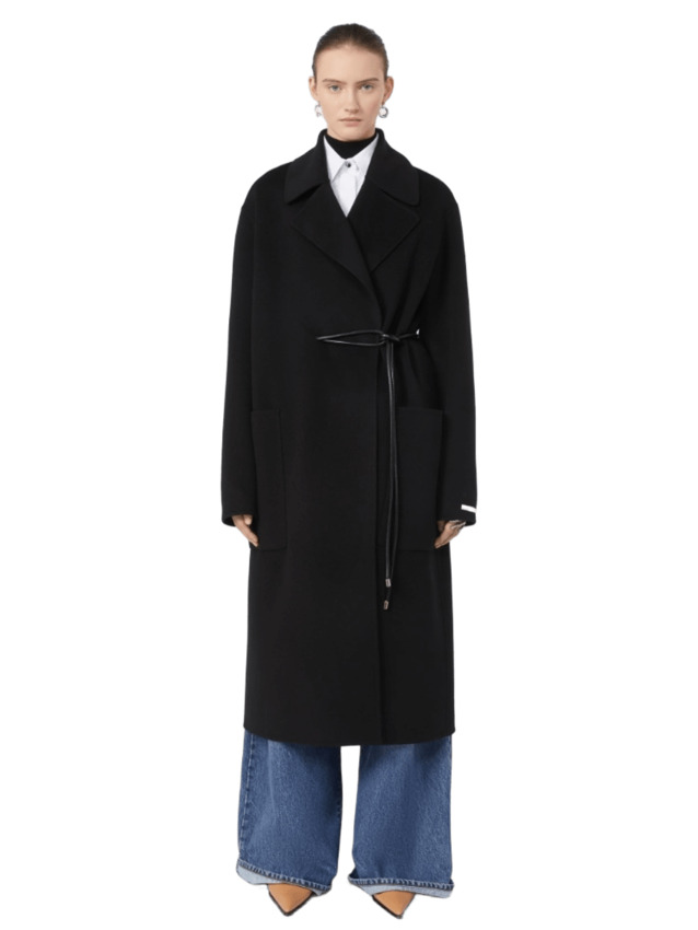 dalla costruzione a vestaglia. Presenta una nota asimmetrica sul fianco destro, dove la cintura passa internamente.