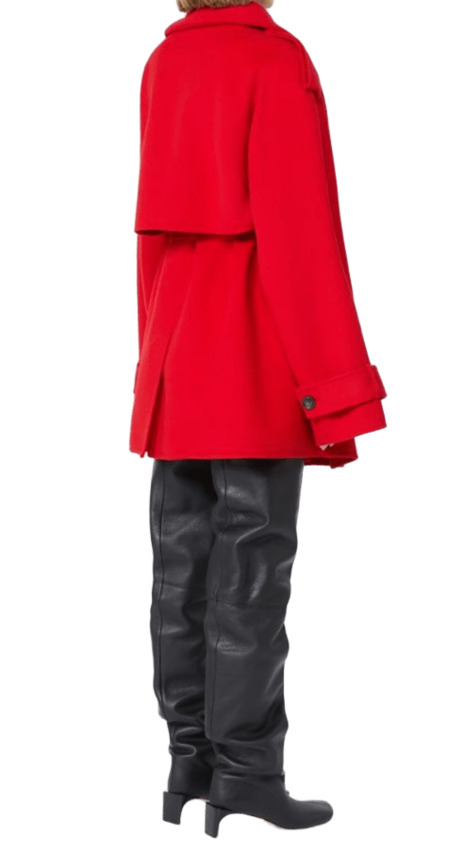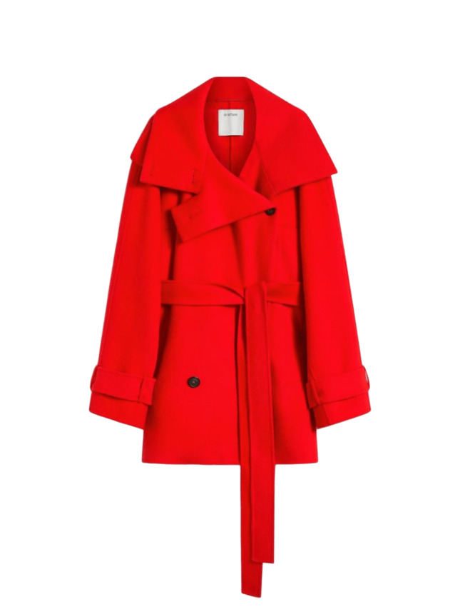 Trench corto in double di pura lana dal volume oversize, con linee rigorose sull'allacciatura e maxi filetti laterali per le tasche. Il collo rialzato con doppio bottone, la bavoletta posteriore e gli alamari si ispirano ai modelli tradizionali. Chiusura laterale con bottoni a vista. Cintura in vita