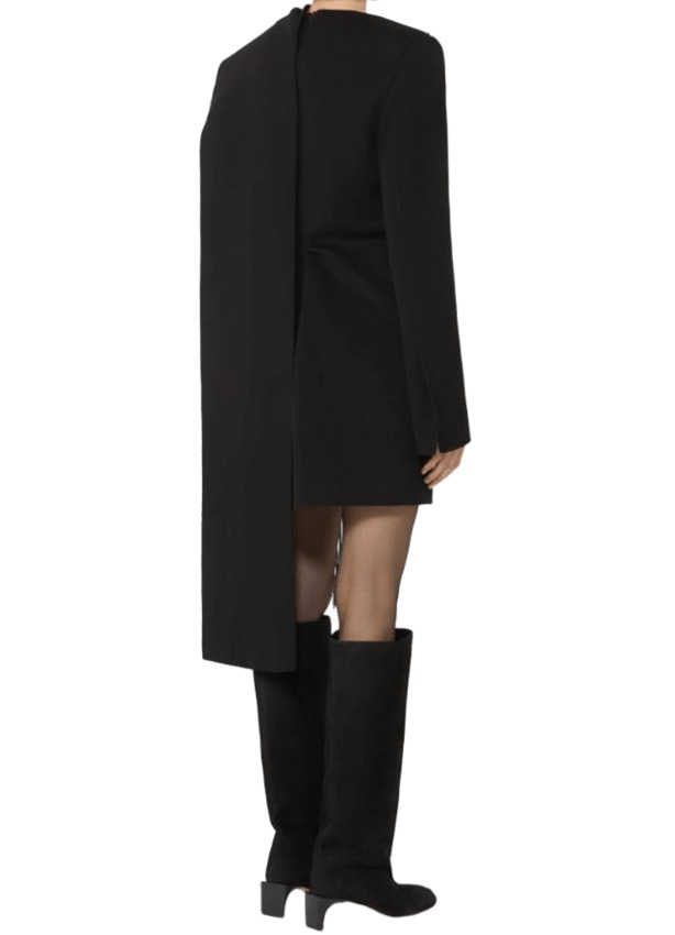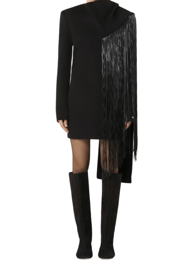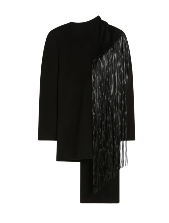 Mini abito dalla linea avvolgente, con collo a cratere, realizzato in morbido drap double di pura lana. La costruzione è innovativa, con sciarpa inserita sul davanti e decorata da frange lunghe in tessuto spalmato.