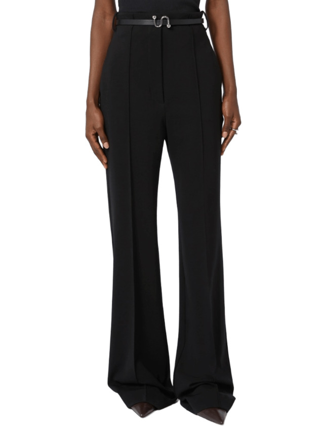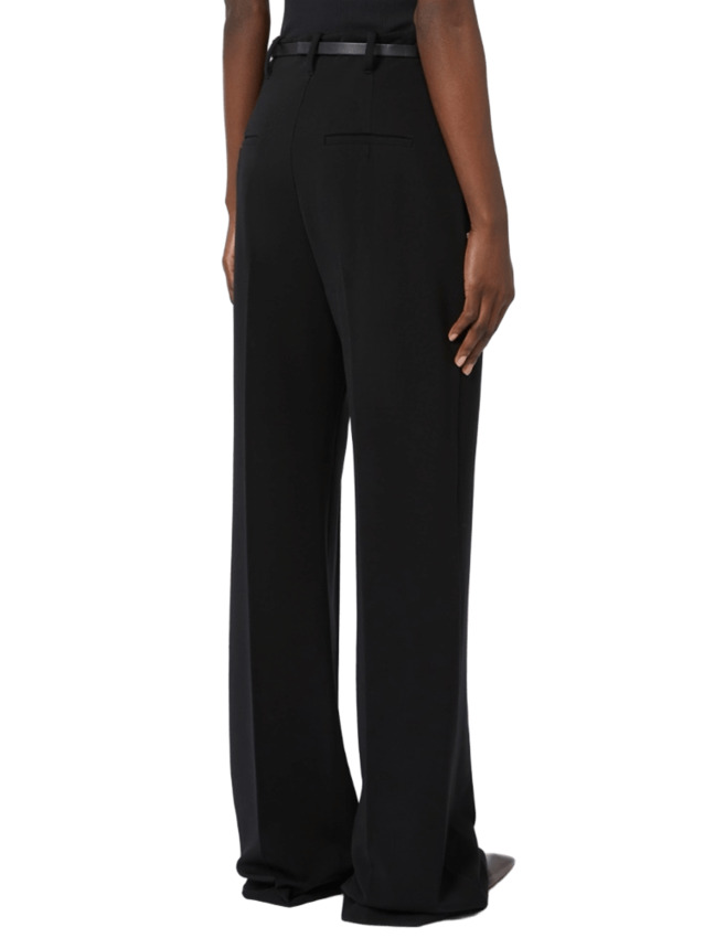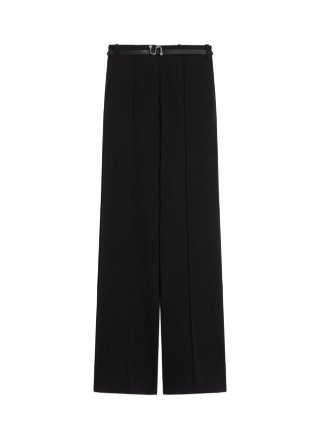 Pantalone realizzato in maglia punto stoffa crêpe, morbido e confortevole. Il modello è caratterizzato da vita alta con cintura in tessuto e fibbia metallica dalla forma a S. Nervature sul davanti e piega stirata sul retro.