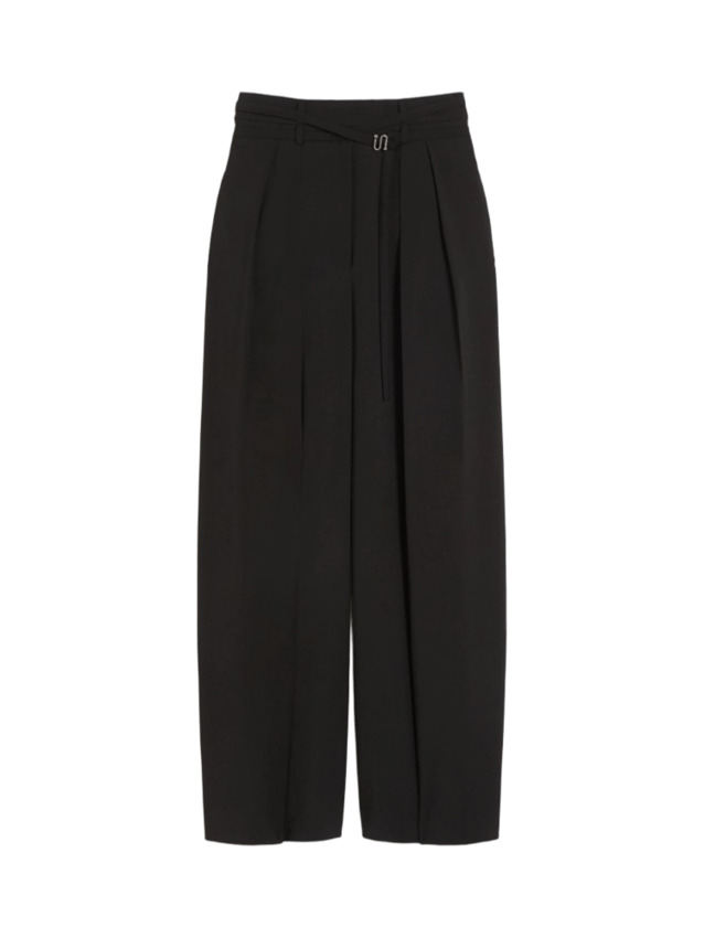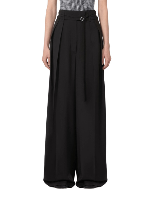 Pantalone in tela di pura lana natural stretch dal volume ampio sulla gamba, con punto vita definito da pince e dalla cintura a doppio giro con fibbia metallica a S.Tasche laterali inserite e posteriori a filetto
