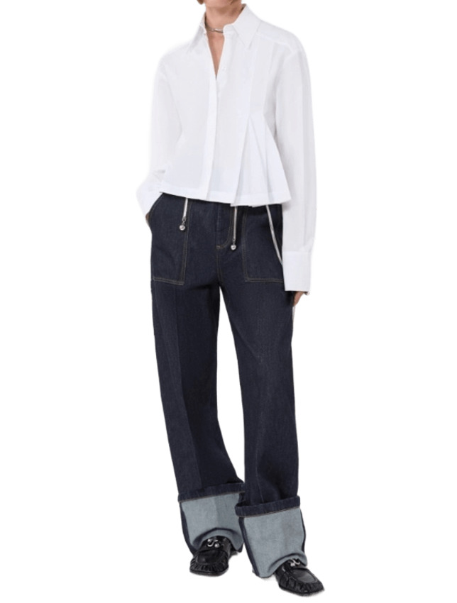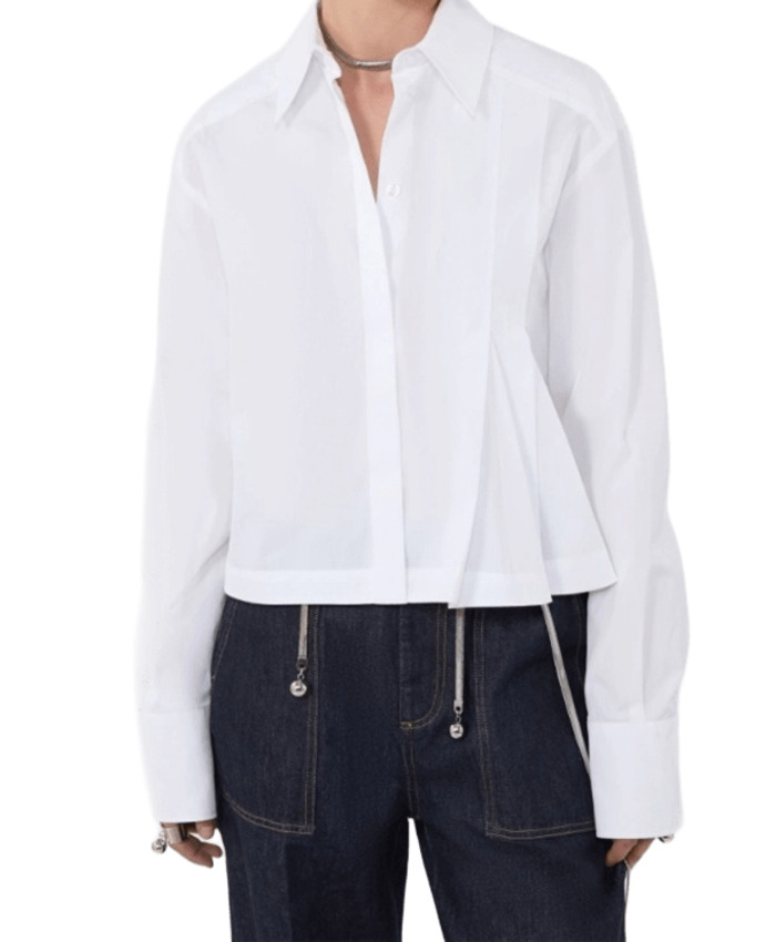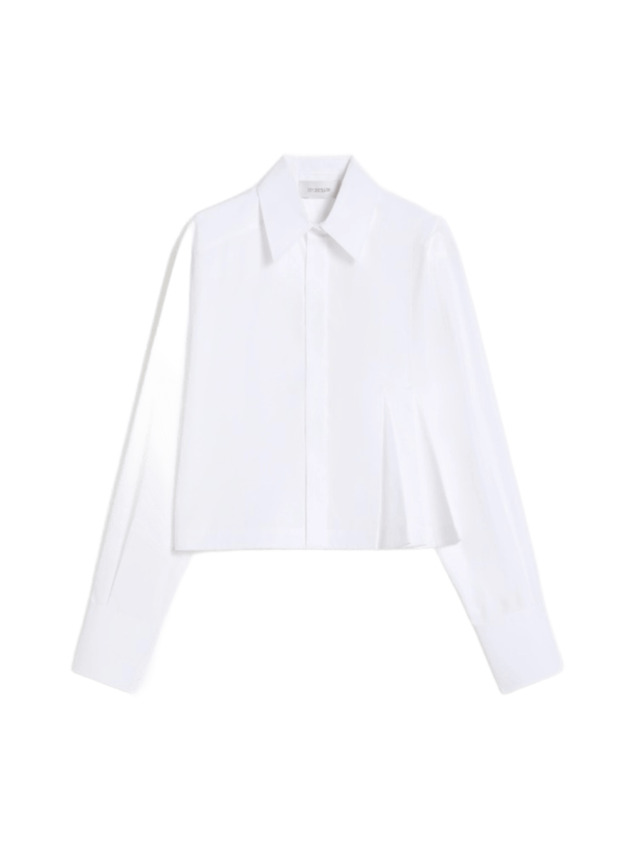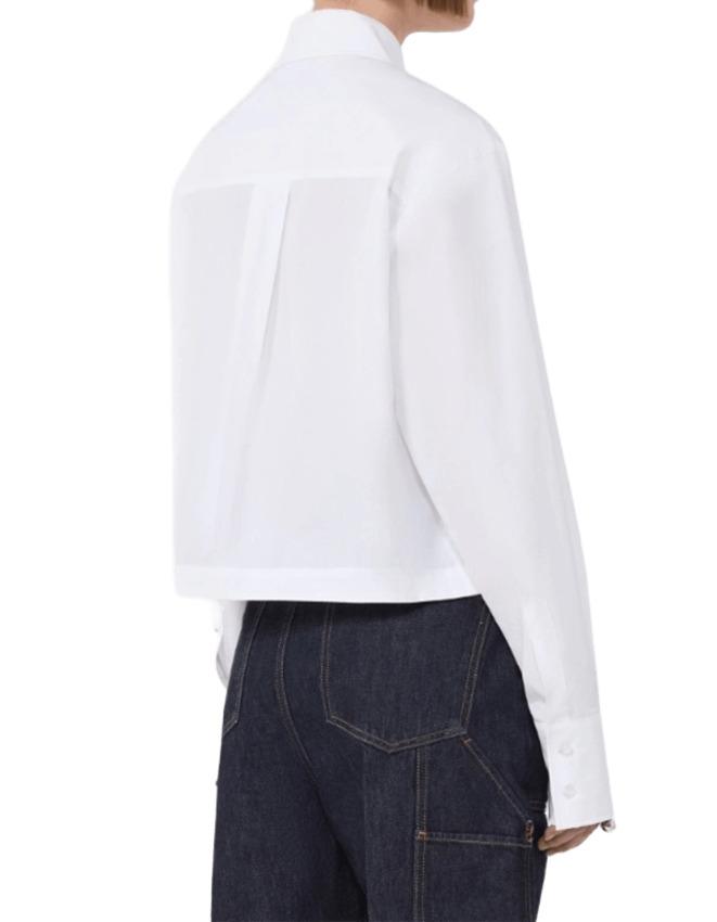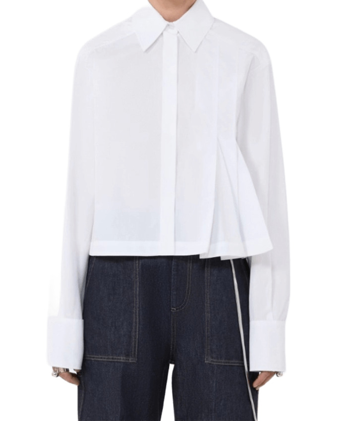 Camicia in popeline di puro cotone, con linea cropped. Sulla parte sinistra è decorata da una doppia piega asimmetrica, che aggiunge movimento.