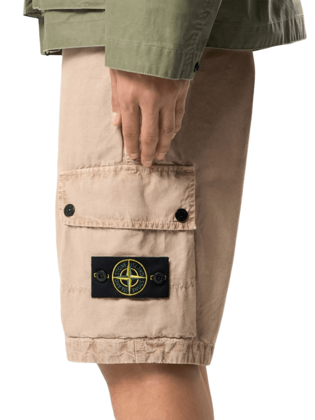 Shorts cargo in tela di cotone biologico spazzolato dotati di tasche verticali con patta fissa e zip nascosta, tasche cargo a soffietto con patta e doppio bottone automatico. Badge Stone Island sulla tasca cargo sinistra. Tasche posteriori oblique con patta fissa e bottone automatico nascosto. Chiusura con bottone e patella con zip. Modello tinto in capo con effetto OLD, per un aspetto leggermente vissuto.