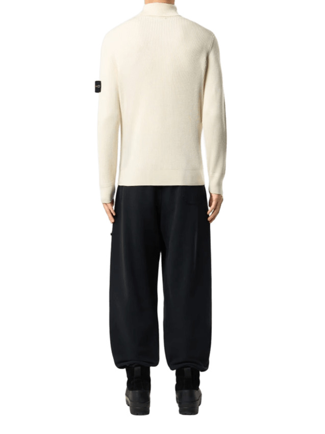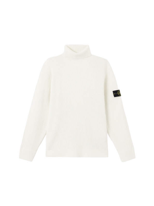 Maglione dolcevita in lana interamente lavorata a costine, colletto a costine, polsini finemente lavorati con impuntura orizzontale, fascia sul fondo rifinita a costine. Finezza 12.