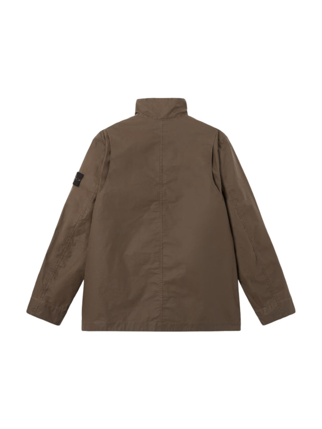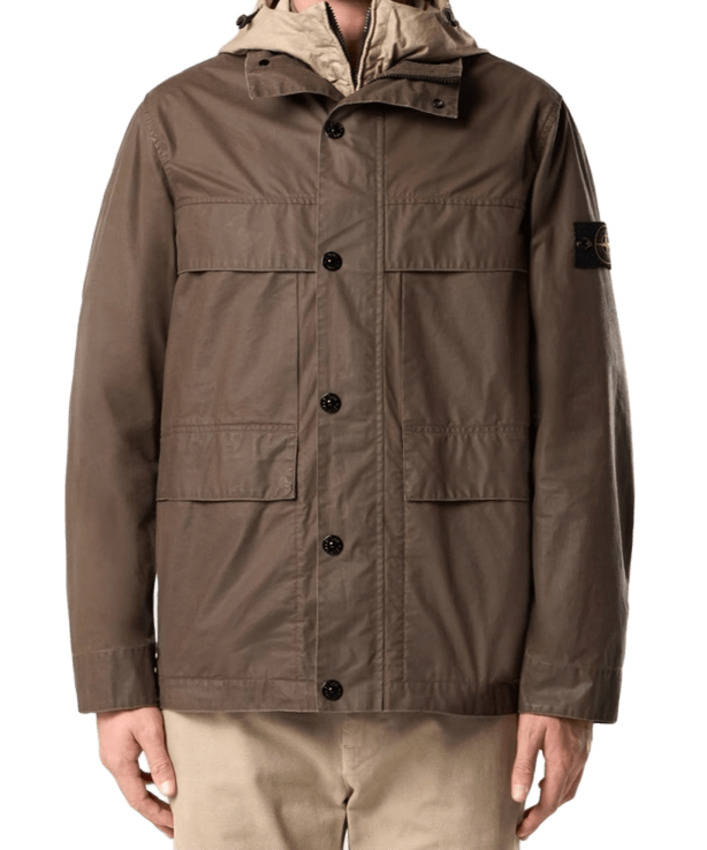 Field jacket in tela in un misto di cotone e poliestere. Presenta un effetto segnato sulla superficie esterna e una spalmatura gommata lucida in tono sul rovescio. Inoltre e caratterizzata da colletto rigido, tasche sul petto con apertura superiore e patta fissa, tasche a filetto con apertura superiore e patta semifissa con bottone automatico, sormontate da tasche oblique. Patta fissa sul retro delle spalle. Badge Stone Island sulla manica sinistra. Polsini elasticizzati internamente. Zip a doppio cursore sotto finta con bottoni automatici. Mesh interna sulla parte superiore del retro.